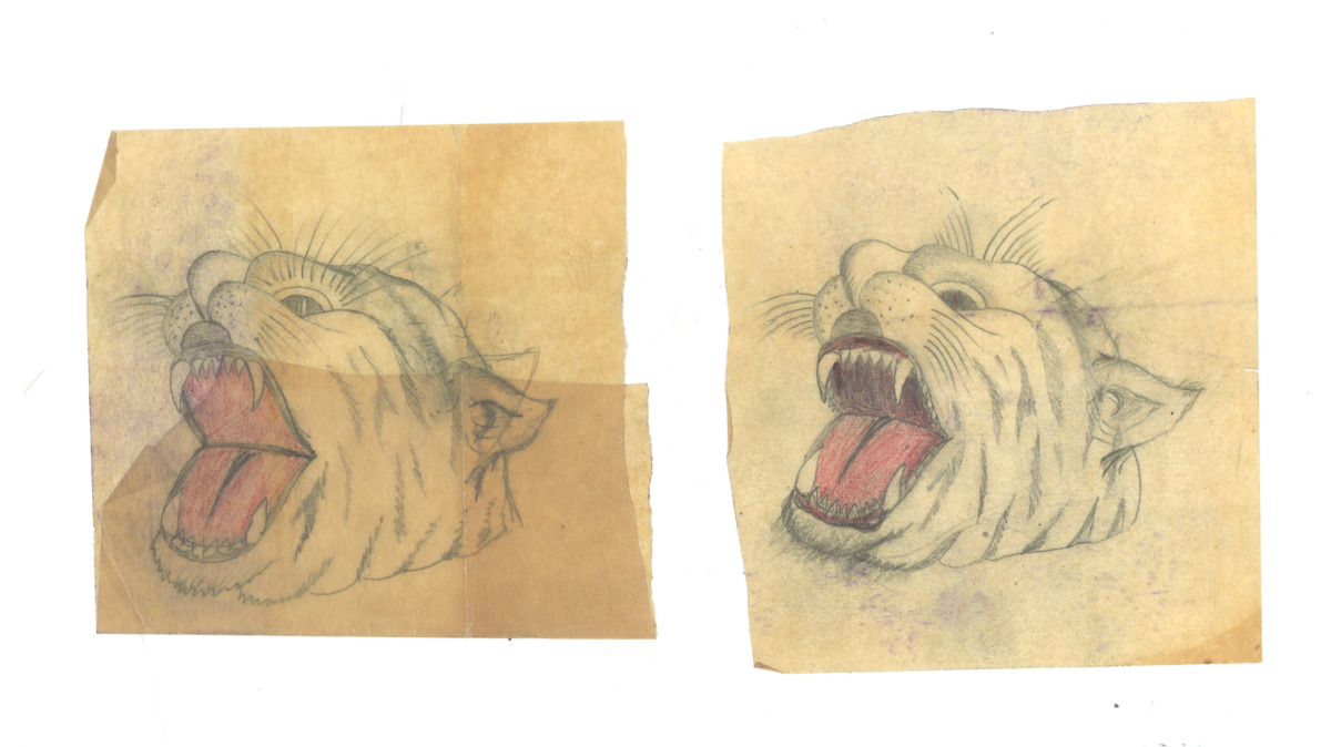 Två stycken mönsterblad i blyerts. Har använts som förlaga till tatuering. Förvararades i fack nr 3 i en röd plånbok av läderimiterad textil. Tatueringen överfördes först på ett smörpapper som i sin tur kalkerades av direkt på huden. Härefter vidtog den verkliga tatueringen.