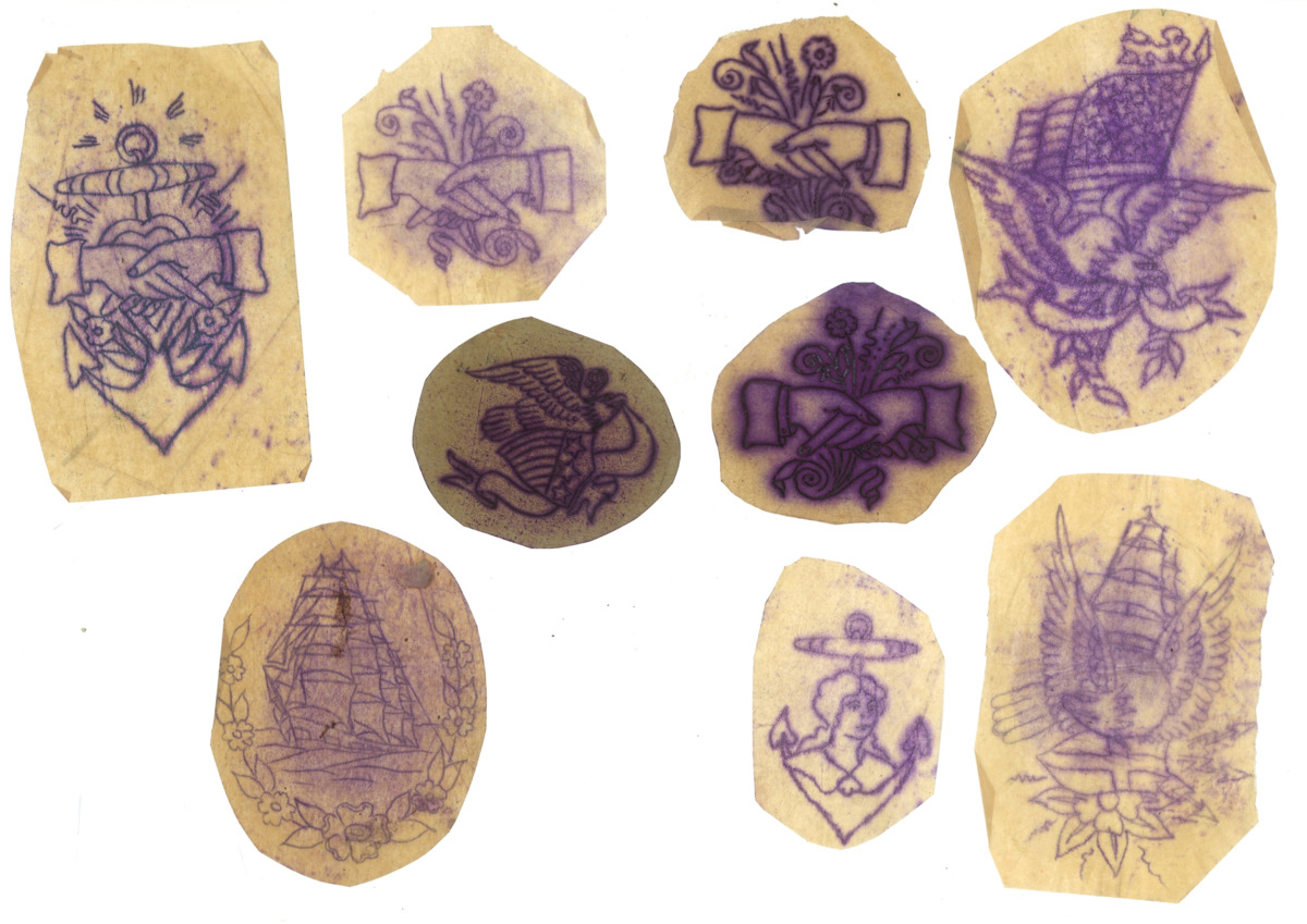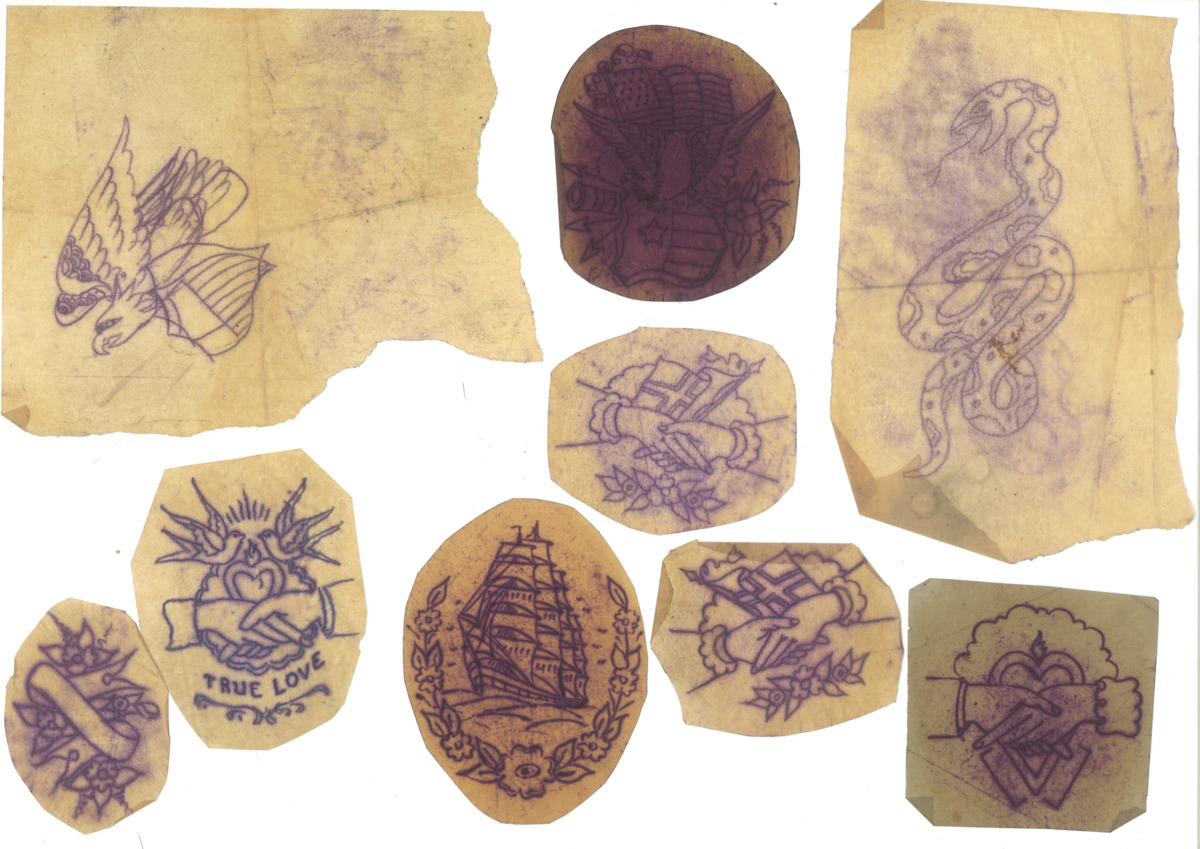 18 stycken mönsterblad i bläck. Har använts som förlaga till tatuering. Förvararades i fack nr 4 i en röd plånbok av läderimiterad textil. Tatueringen överfördes först på ett smörpapper som i sin tur kalkerades av direkt på huden. Härefter vidtog den verkliga tatueringen.