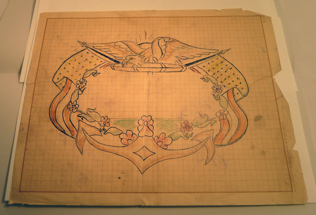 Färglagd tatueringsskiss uppritad på milimeterpapper.