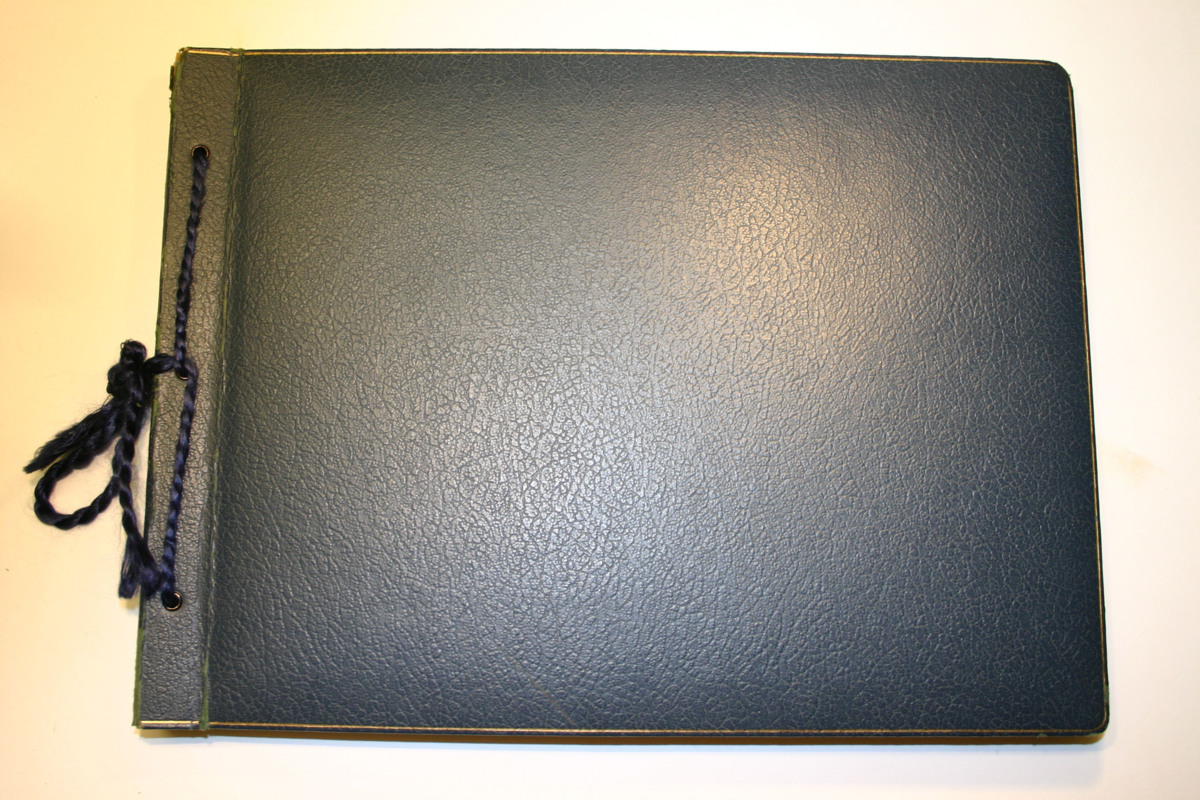 Blått läderalbum med svartvita fotografier av inredning ombord m/s STOCKHOLM. Fotografierna visar den andra versionen av STOCKHOLM