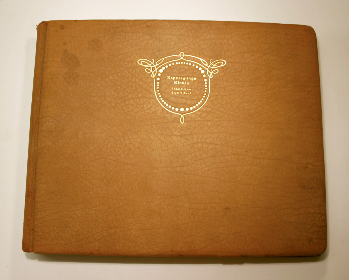 Brunt album i mockaläder med guldtryck på framsidan. Innehåller svartvita fotografier från seglartävlingar, fester, platser m.m. som Badgästernas Segelförbund varit med om under början av 1900-talet.