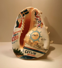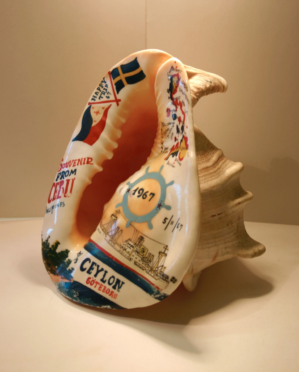 Snäckan inköptes på en resa med m/s CEYLON 1967 då givaren var matros ombord. Snäckorna dekorerades på kajen av försäljare i hamn på Cebu i Filippinerna. I hamn kunde man även köpa målade sidentavlor föreställande de olika fartygen som låg i hamn. Souvenirförsäljarna fixade snabbt till special målade tavlor och snäckor när fartygen kom i hamn.