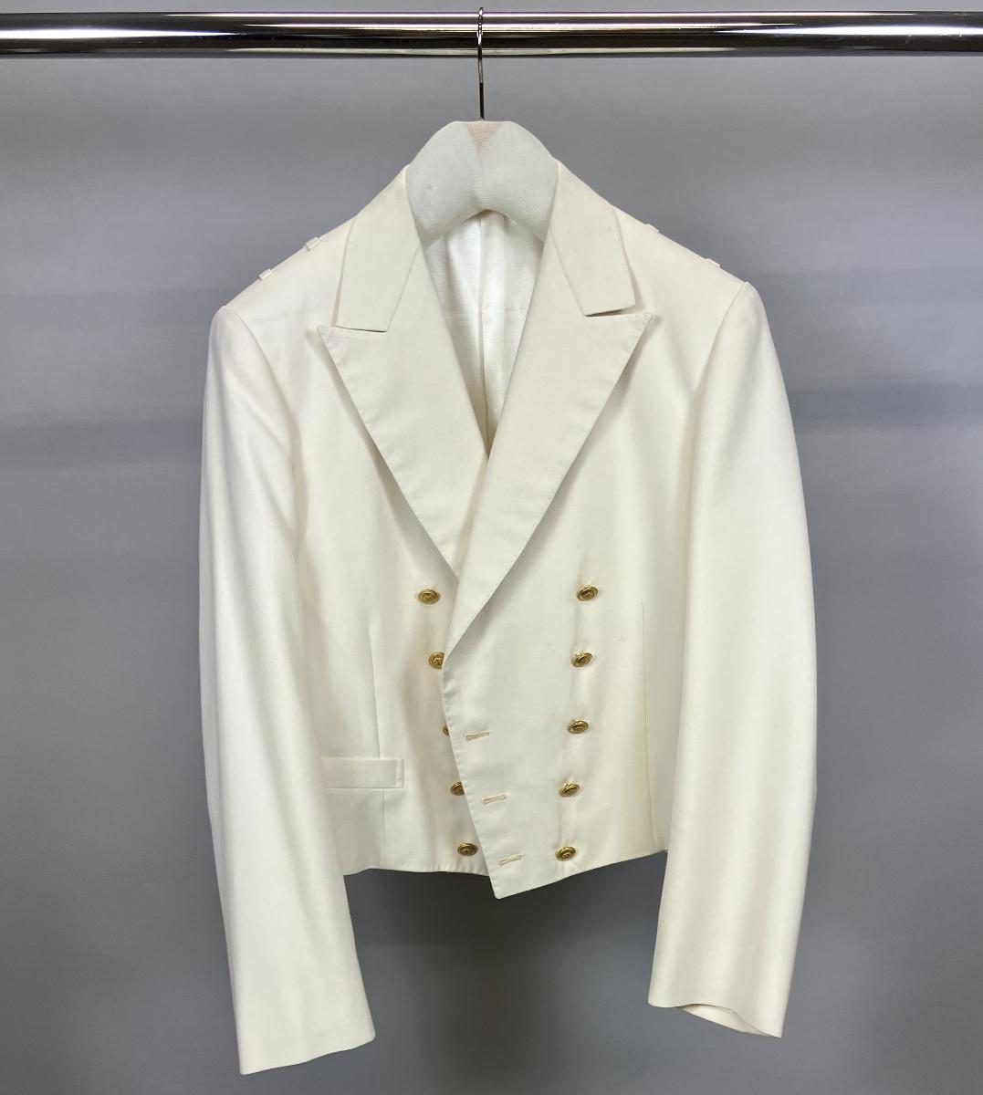 Kort vit mässjacka i syntettyg med mässningsknappar.