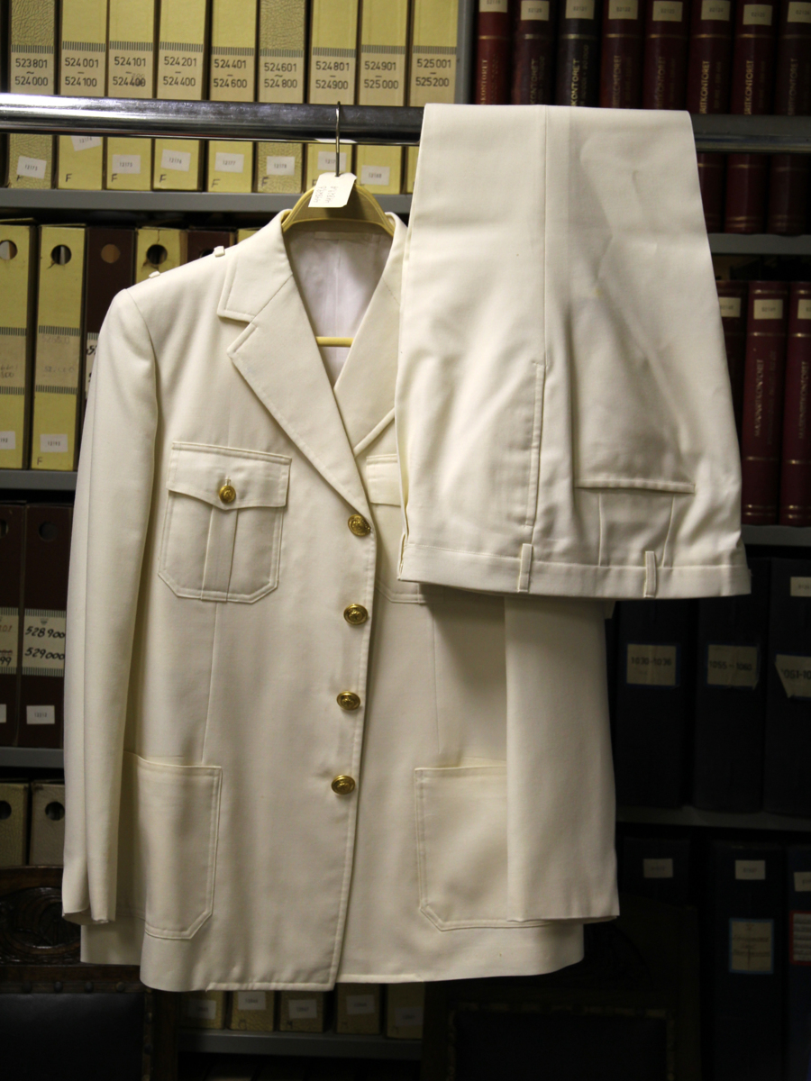 Vit mässbyxa i syntettyg med mässningsknappar.