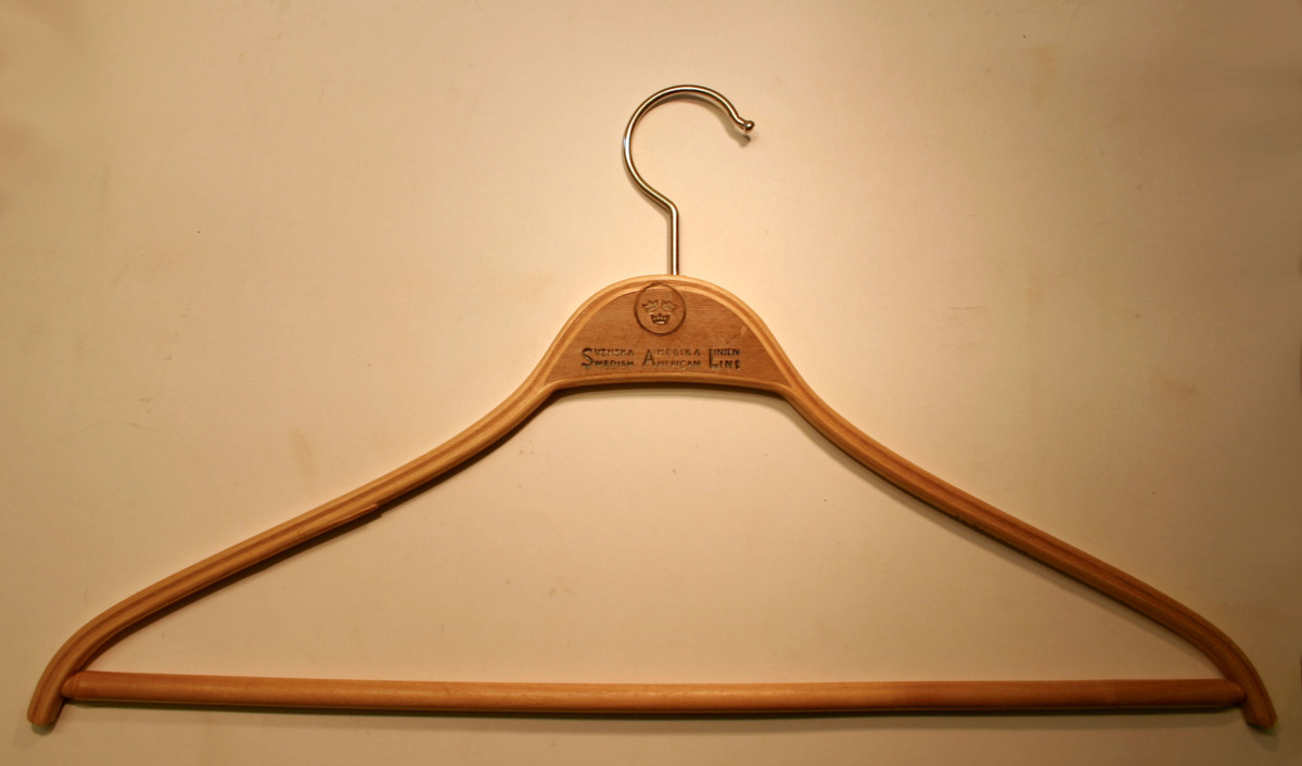 Galge i trä med metallkrok. Galgen har tryck på båda sidor.