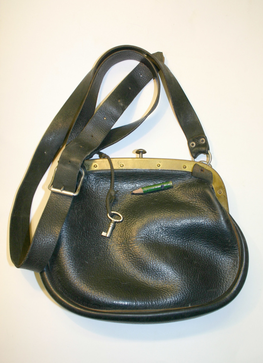 Mörkbrun biljettväska i läder med metallspänne med lång axelrem. Väskan har en nyckel fastbunden med bomullssnöre, nyckeln går till väskans lås. I väskan finns en liten blyertspenna och sex stycken gula biljetthäften och två lösbiljetter. Väskan har annvänts på Sjöfartsmuseet fram till 1960-talet för att sälja separatbiljetter för inträde till Akvariet. Biljettförsäljaren stod vid ingången till akvariedelen.