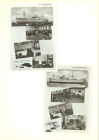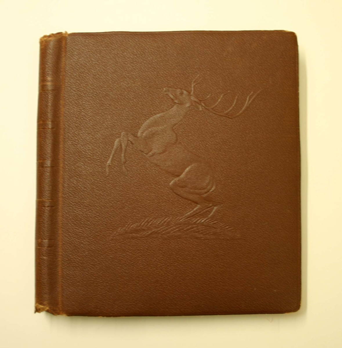 Mörkbrunt fotoalbum i konstläder med en hjort i relief på framsidan. Innehåller svartvita fotografier från resor, ombord fartyg, barnbilder m.m.