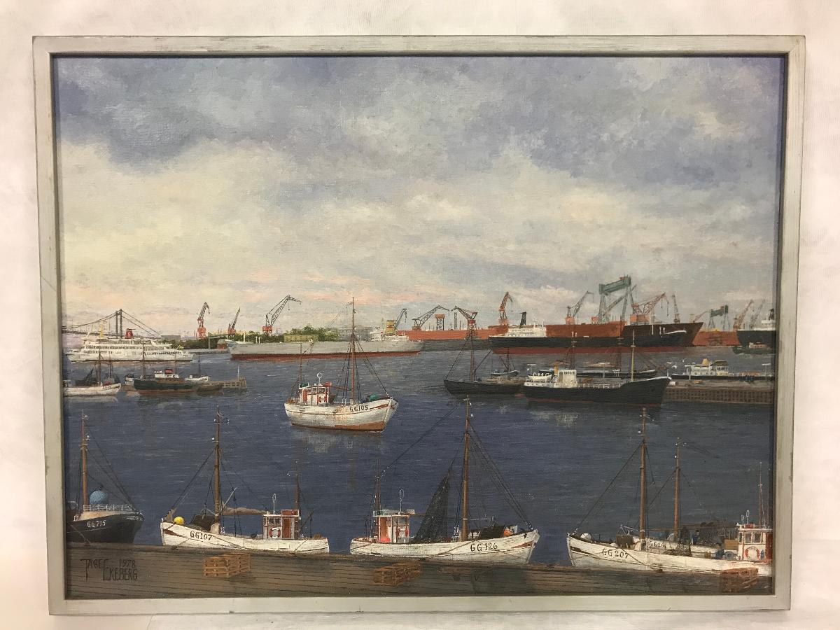 Hamnmotiv från Göteborg med fartyg, fiskebåtar, dockor, Älvsborgsbron och kranar. Målad i olja på linneduk. Duken är spännd på ram och inramad i silverfärgad träram.