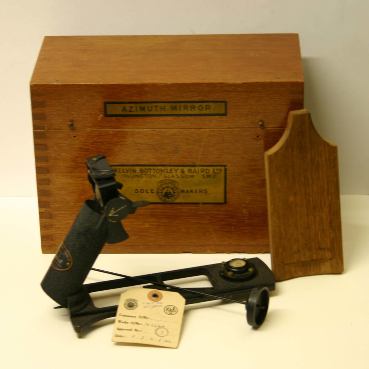 En Azimuth instrument i trälåda. Instrumentet används för mätning av bäring. I lådan låg en pappersetikett med tillverkningsnummer och tillverkningsdatum (1946-04-05).