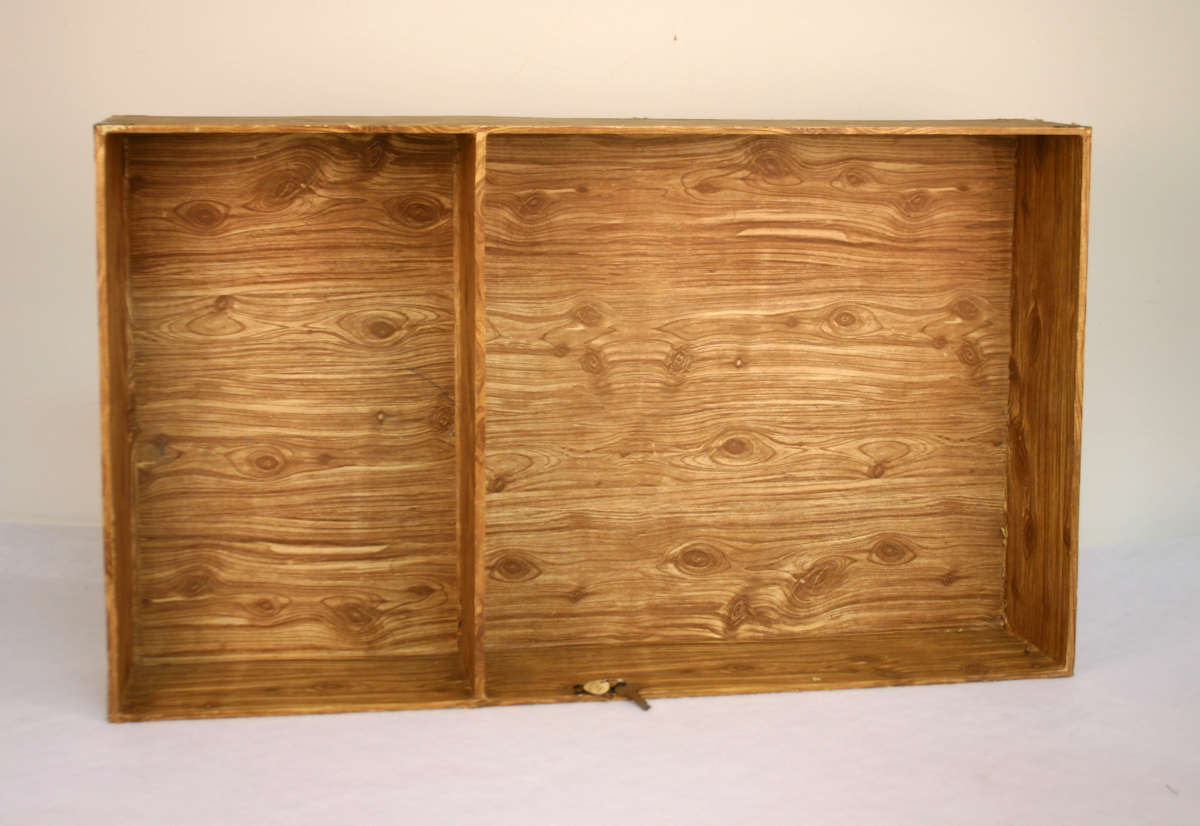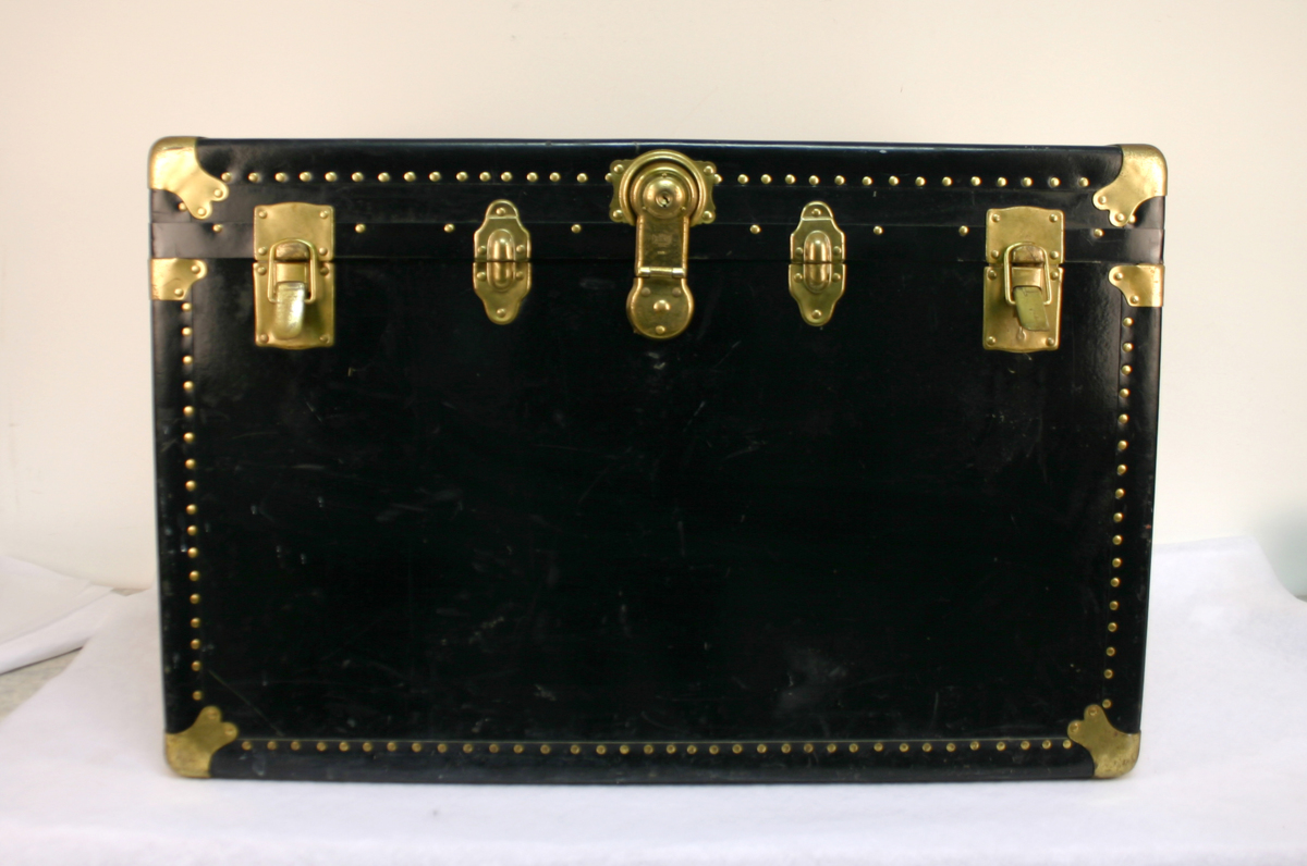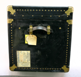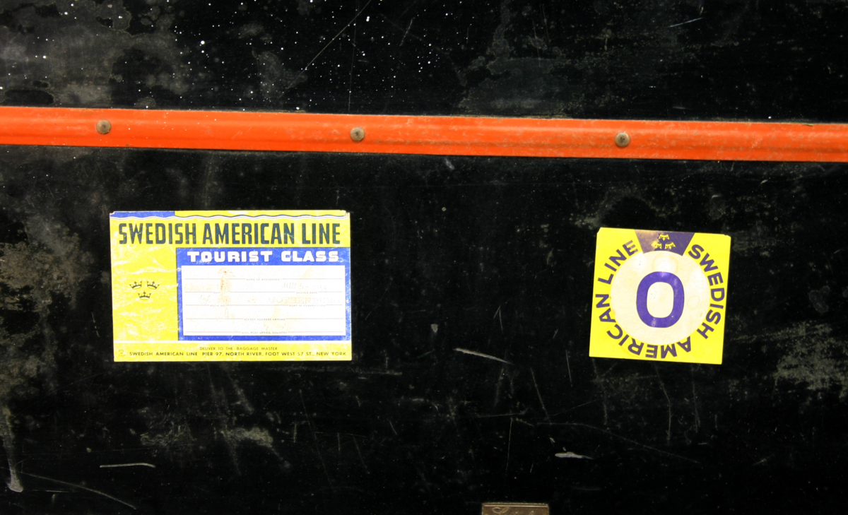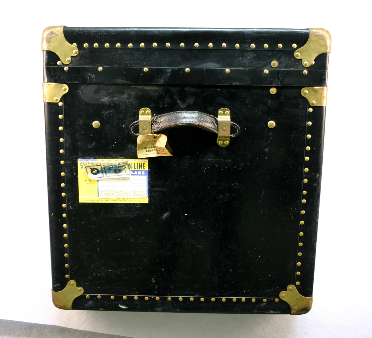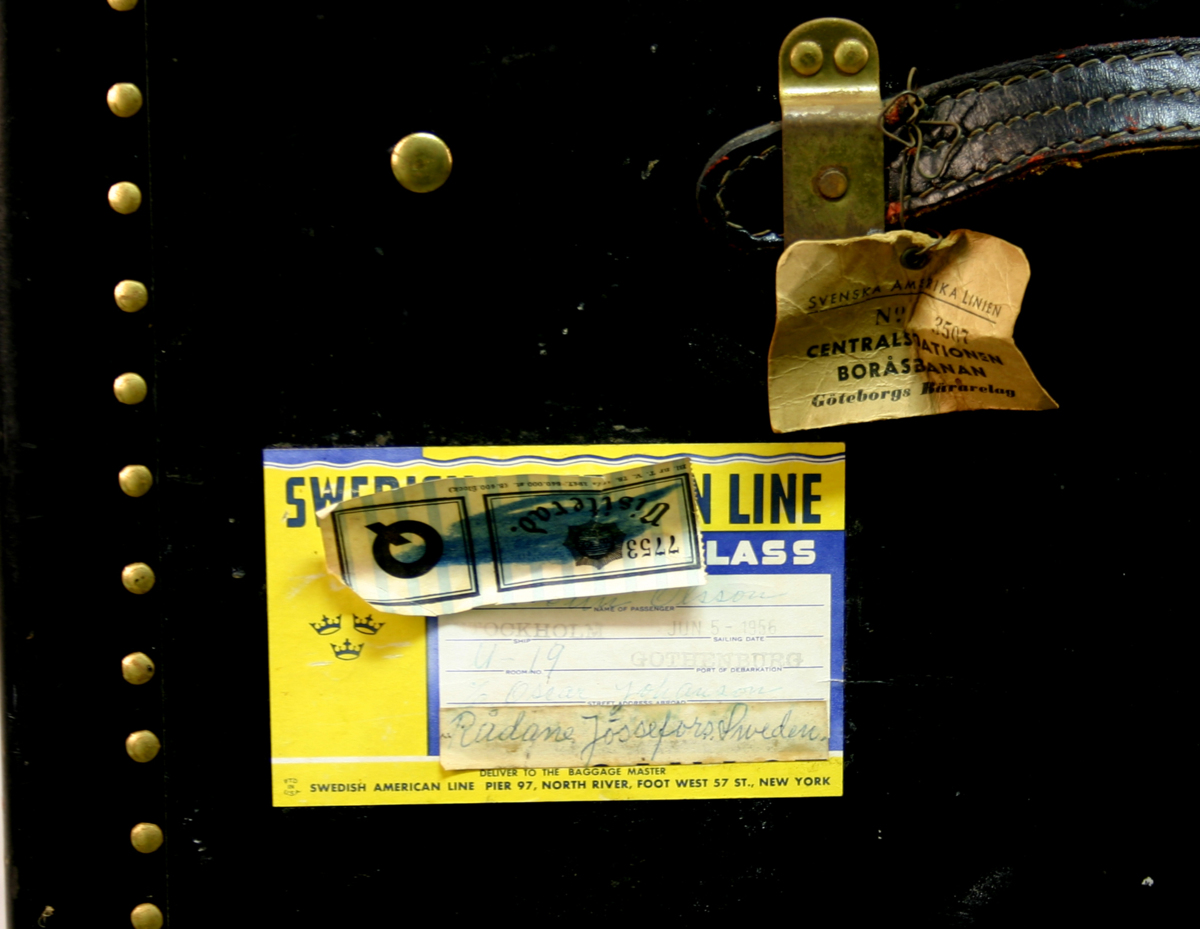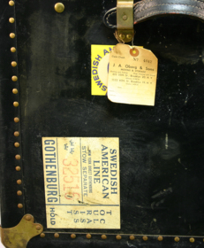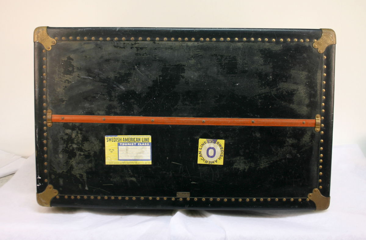 Låsbar svart resekoffert med förstärkta hörn. I kistan finns en löstagbar lådinsats med två fack. Insidan är klädd i plastfaner föreställande trä. På utsidan av kofferten finns etiketter och klistermärken som talar om när och hur kofferten har rest med Svenska Amerika Linien.