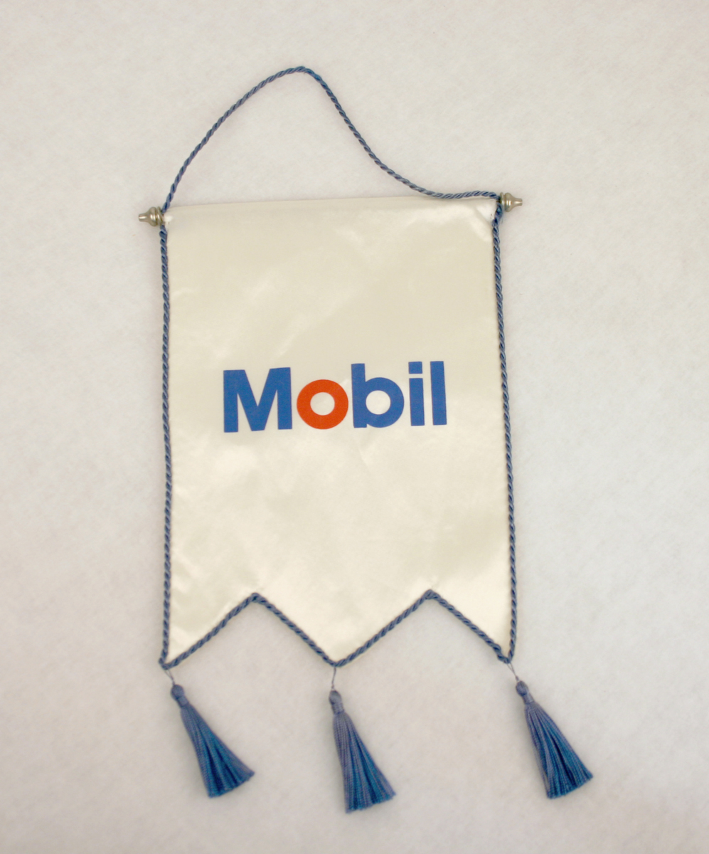 Bordsflagga i vitt med blå snören och tofsar. Logga tryckt i blått och rött.