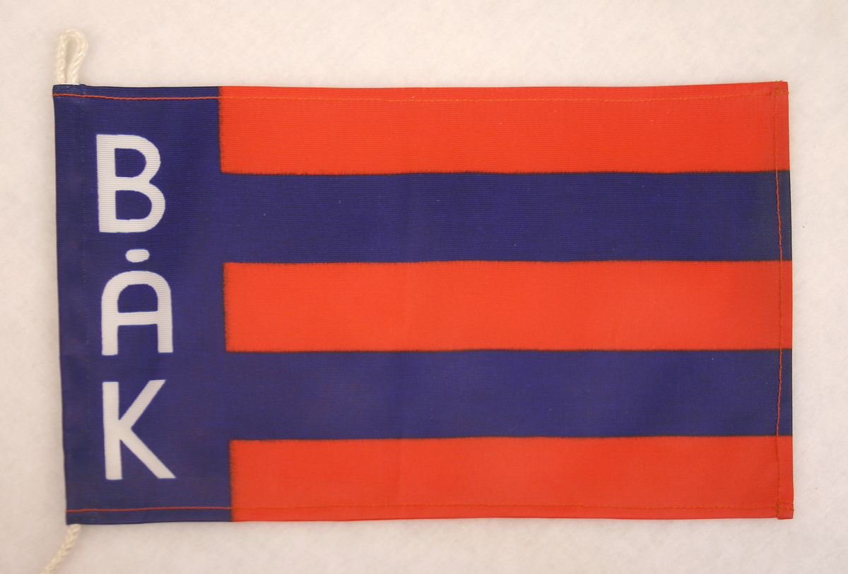 Bordsflagga i blått och rött med vitt snöre. Logga tryckt i vitt.