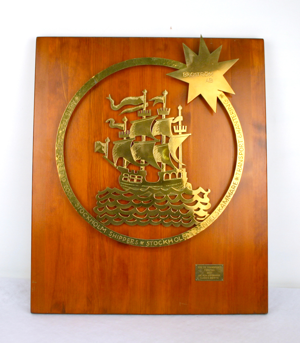 Prisplakett i lackat trä med mässingsdetaljer för Årets transportföretag 2001.