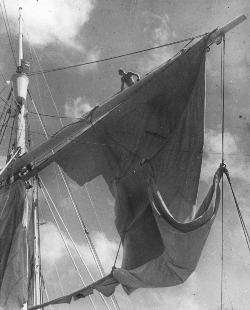 "En natt med byigt väder då ALBATROSS gick upp i vind för att göra det möjligt att ta en hydrografisk serie, rämnade bredfocken." Bildtext ur J. Erikssons bok.