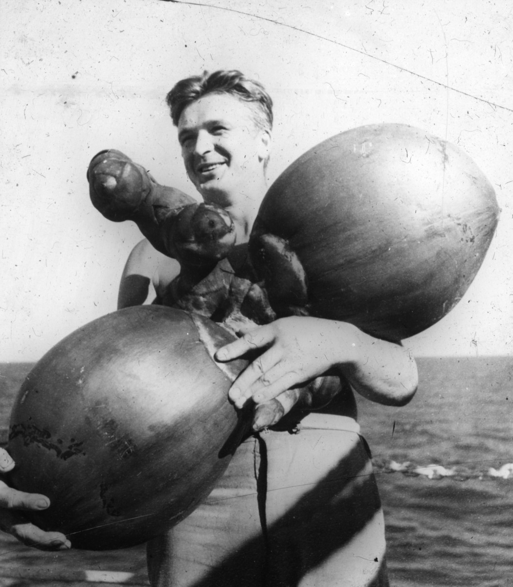 "Dubbelkokosnöten, frukten av Lodoicea Seychellarum, är världens största trädfrukt. Harry, den kraftige västkustgrabben, har full börda." Bildtext ur J. Erikssons bok.