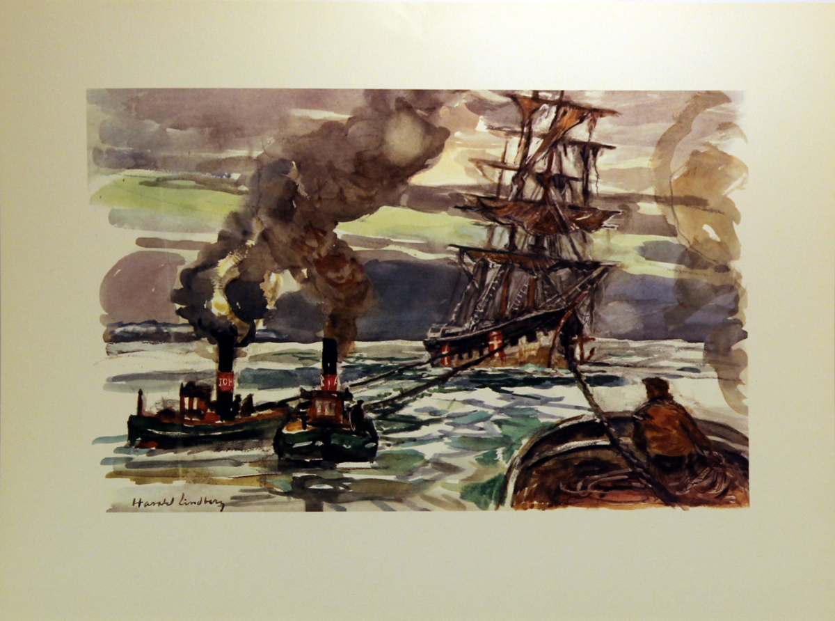 Ingår i en mapp med färgtryck föreställande Röda Bolagets fartyg. Järnbarken PEHR UGLAND, på drift genom Kattegatt vintern 1917, övergiven av besättningen efter att först ha strandat på skagerns Rev. I drivis och dåligt väder lyckades man att från bogserbåten ARTUR sätta ombord folk och få över en tross, så att bogsering mot Göteborg kunde påbörjas. På väg dit kom även bogserbåtarna JOHN och BALDER till undsättning. Maskinstyrkan i dessa bogserbåtar var 140, 100 respektive 300 HK.