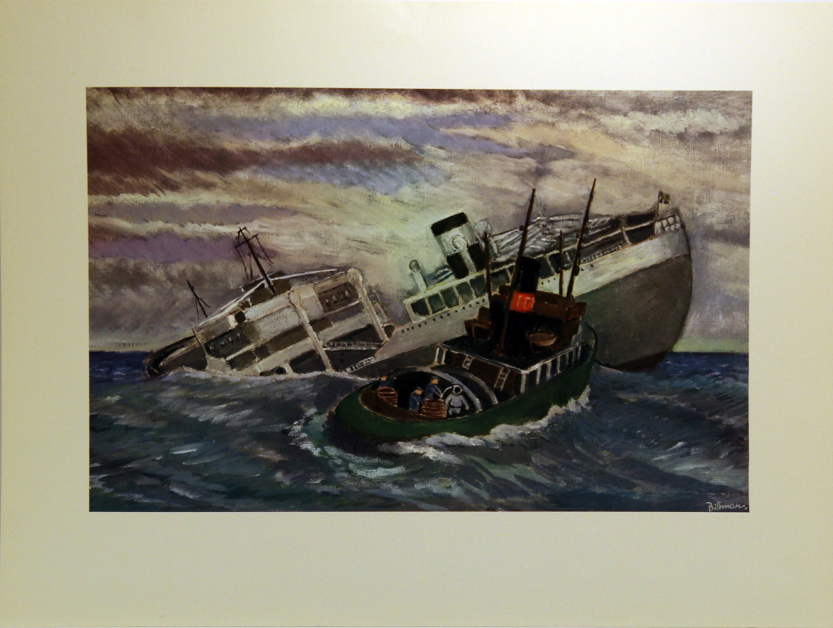 Ingår i en mapp med färgtryck föreställande Röda Bolagets fartyg. Ett tankfartyg om 15.000 ton d.w. strandat år 1945 på svenska västkusten. Fartyget, som hade full last av råolja, fick vid strandningen svåra skador på babord sida och blev stående på grundet med stora delar av detta inskjutande i skrovet. FRITIOF, HARALD och HERBERT lyckades att under svåra väderleksförhållanden redan efter fem dagars arbete flottaga haveristen samt bogsera in den i skyddande skärgård för utlossning av lasten samt tätning.