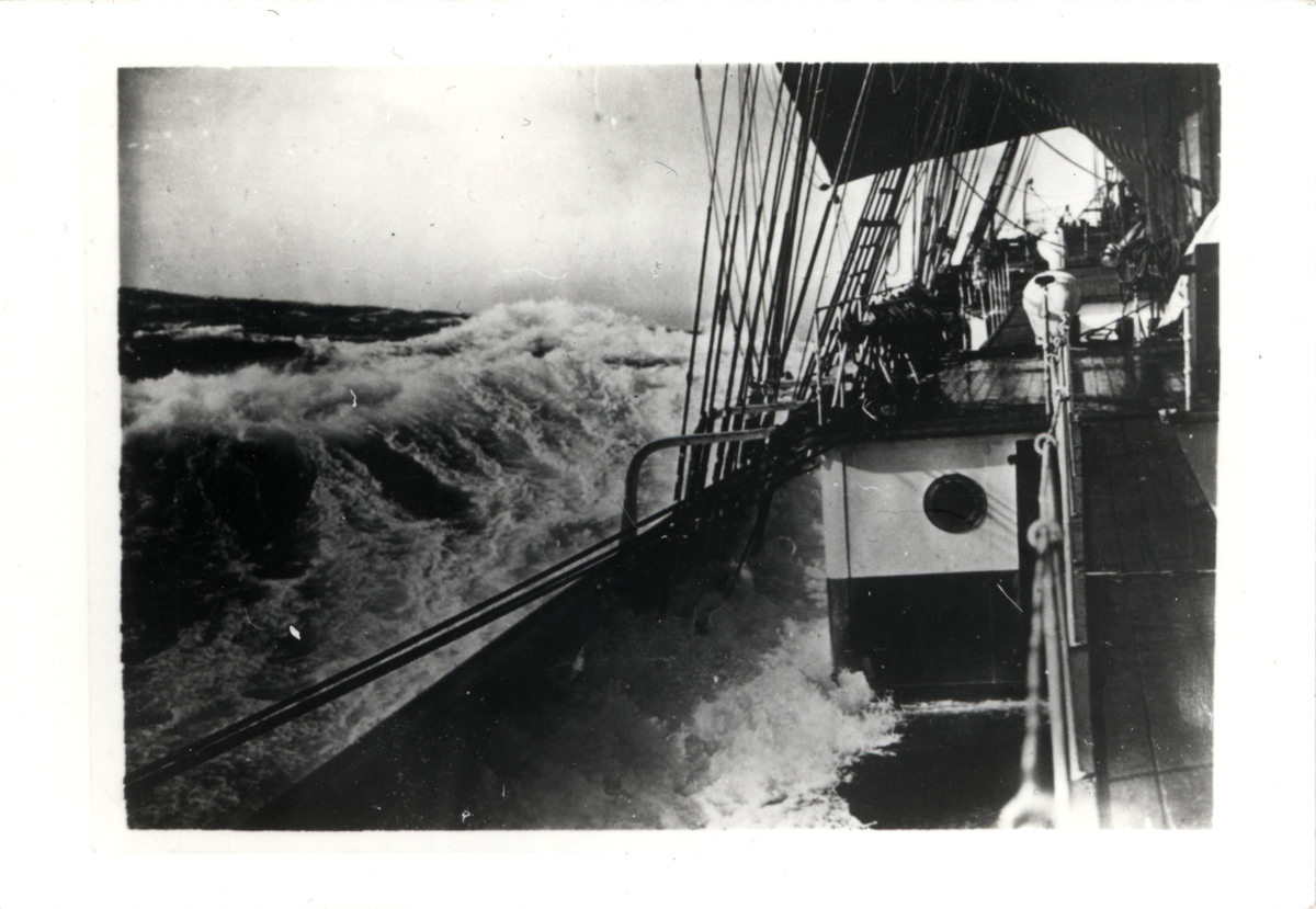 Fotografi föreställande barbords däck i storm på C.B. PEDERSEN, en fyrmastad bark byggd 1891 i Italien. Ägdes från 1922-1937 av rederi AB Portunus från Göteborg