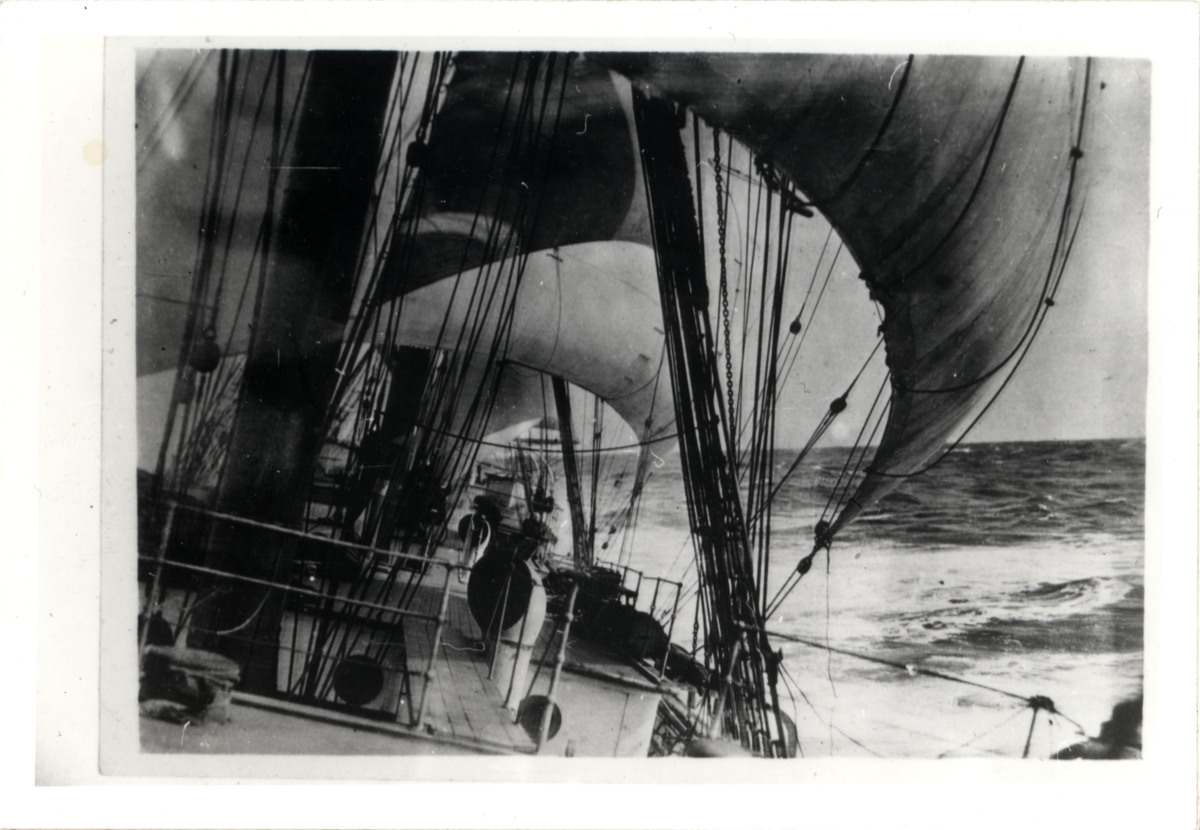 Fotografi föreställande styrbords däck i storm på C.B. PEDERSEN, en fyrmastad bark byggd 1891 i Italien. Ägdes från 1922-1937 av rederi AB Portunus från Göteborg