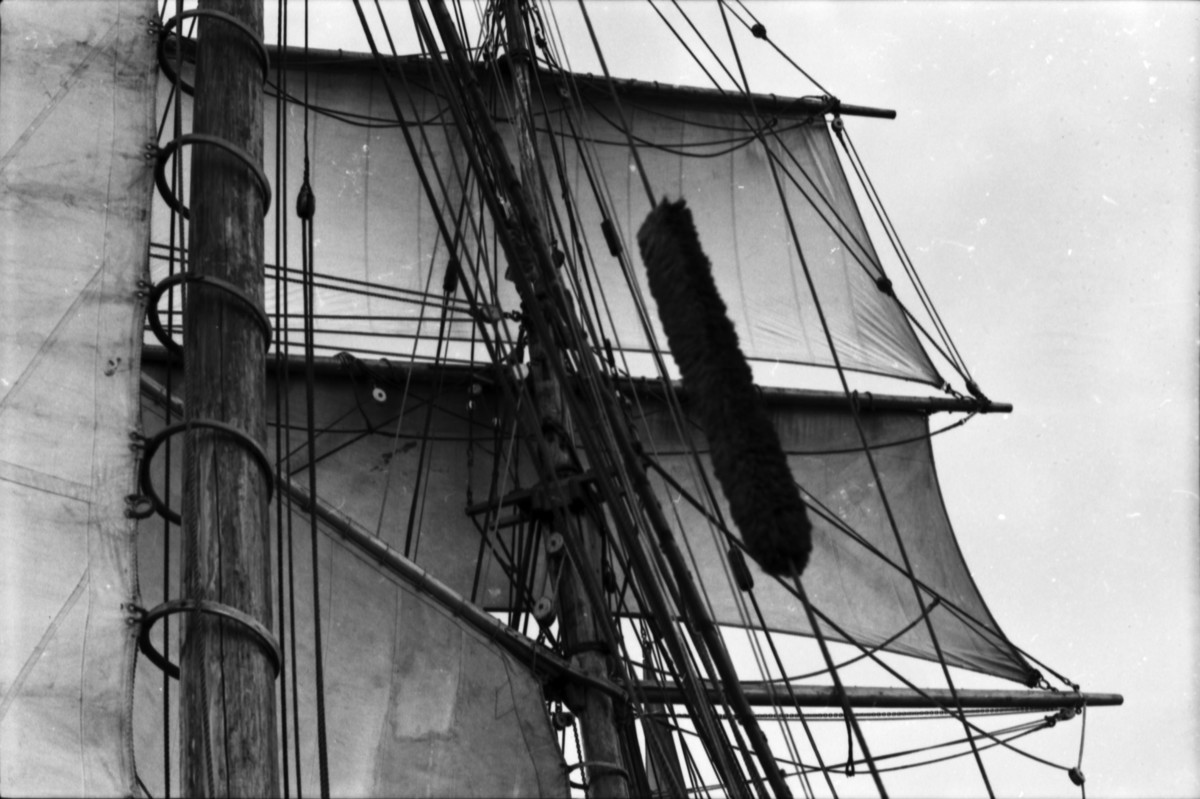 Svartvitt fotografi föreställande dikt bidevind för styrbords halsar, på LILLA DAN, ett skonertskolskepp om 94 brt. Fotot taget i Kattegatt eller Östersjön i augusti 1977.