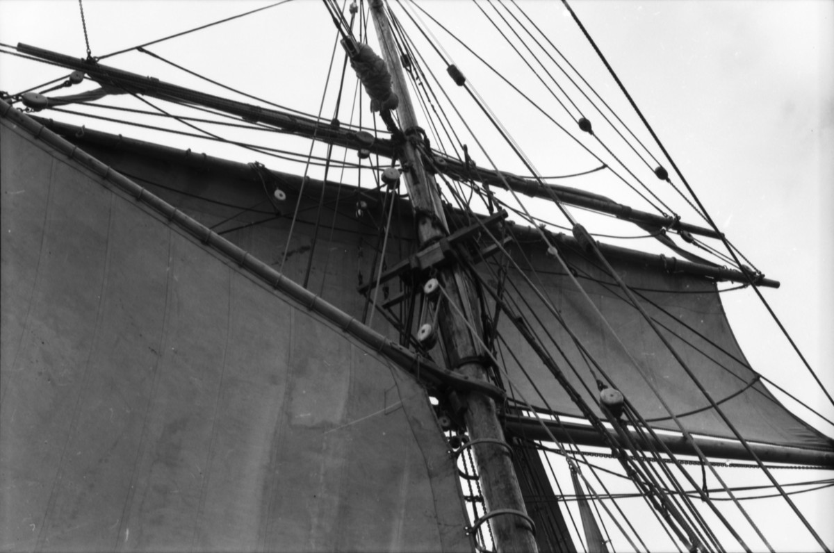 Svartvitt fotografi föreställande fockmasten akter i från på LILLA DAN, ett skonertskolskepp om 94 brt. Fotot taget i Kattegatt eller Östersjön i augusti 1977.