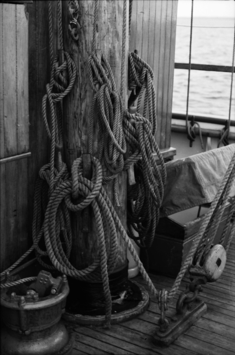 Svartvitt fotografi föreställande stormasten och skonertskotet på LILLA DAN, ett skonertskolskepp om 94 brt. Fotot taget i Kattegatt eller Östersjön i augusti 1977.