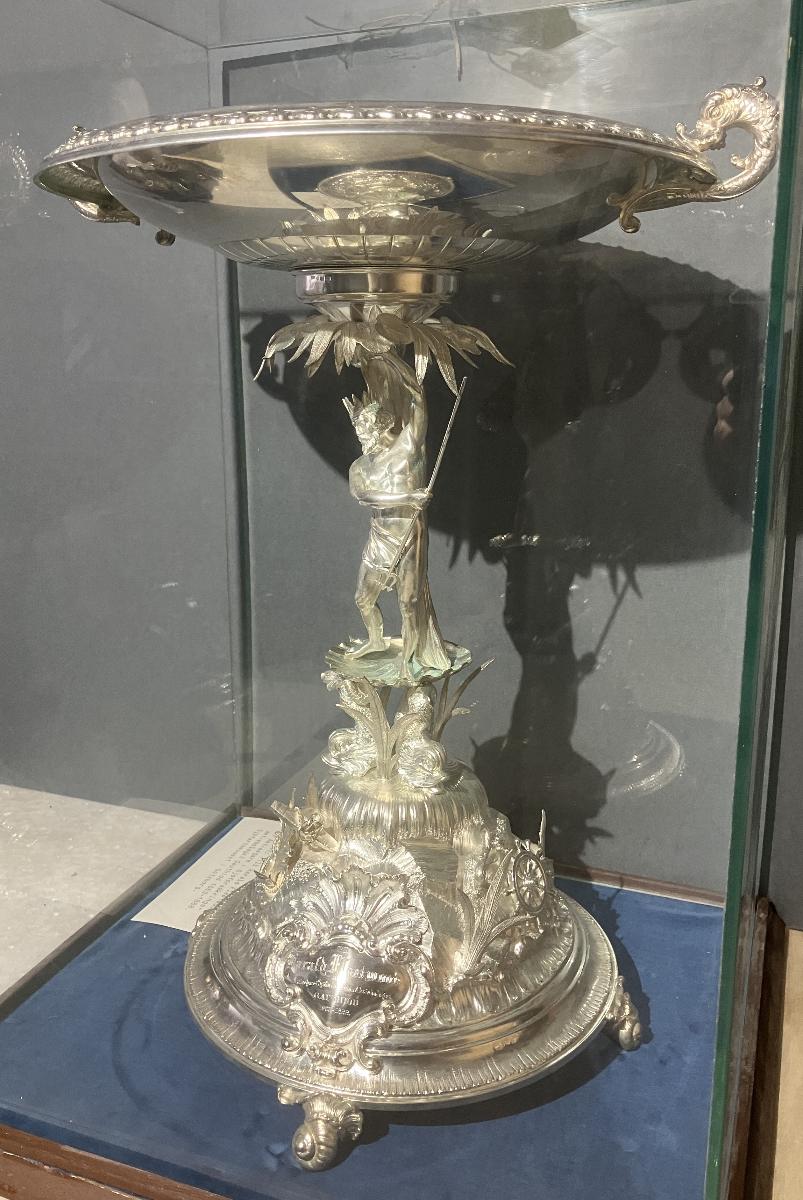 Silverpjäs i monter av glas. Pjäsen kallades "Neptunus".
