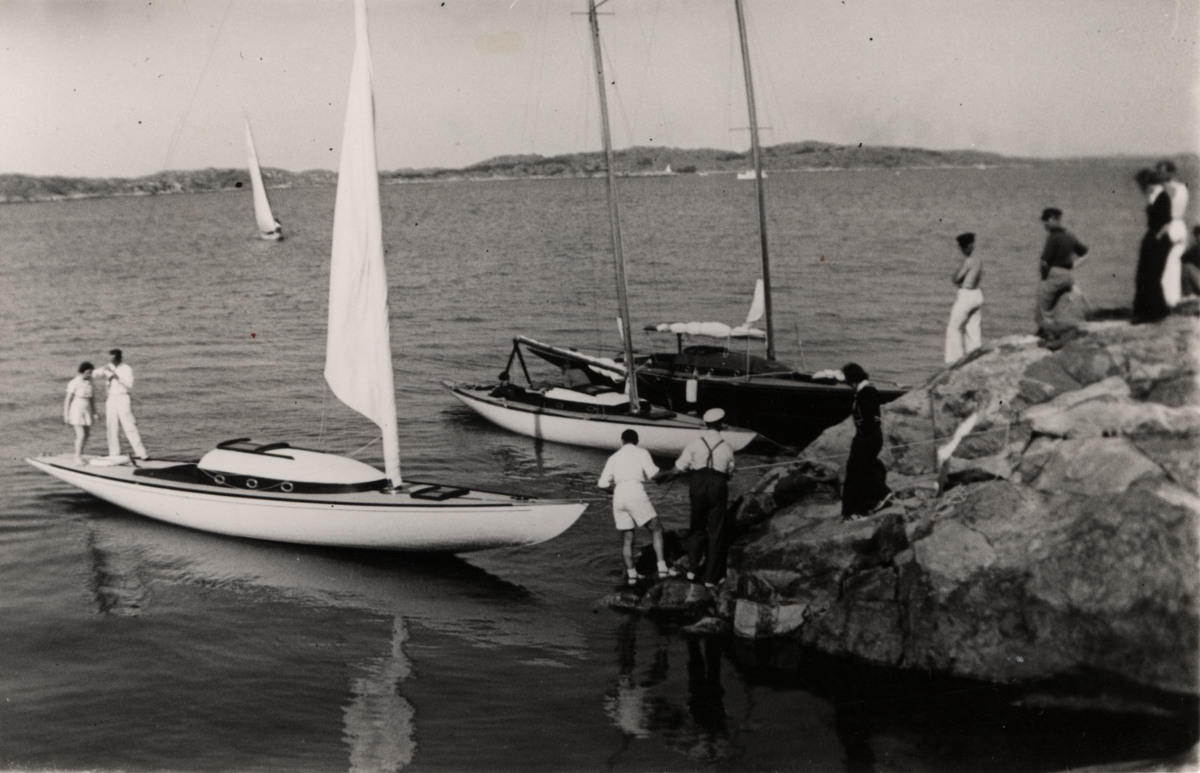 Fotografi föreställande tre segelbåtar samt nio personer på Aeolus-ön utanför Göteborg 1937. Båten närmast kameran har en Ljungströmrigg, som vid den här tiden var ny då den först konstruerades av Fredrik Ljungström 1933.