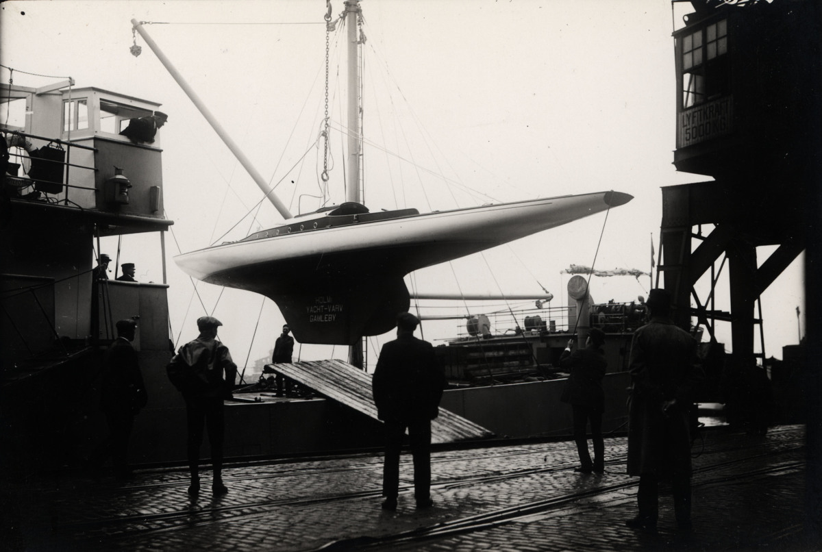 Papperskopia av fotografi föreställande den svenska olympiaseglaren SIF som den 10 juni 1920 lastas ombord på ett fartyg för att skeppas till OS i Antwerpen.