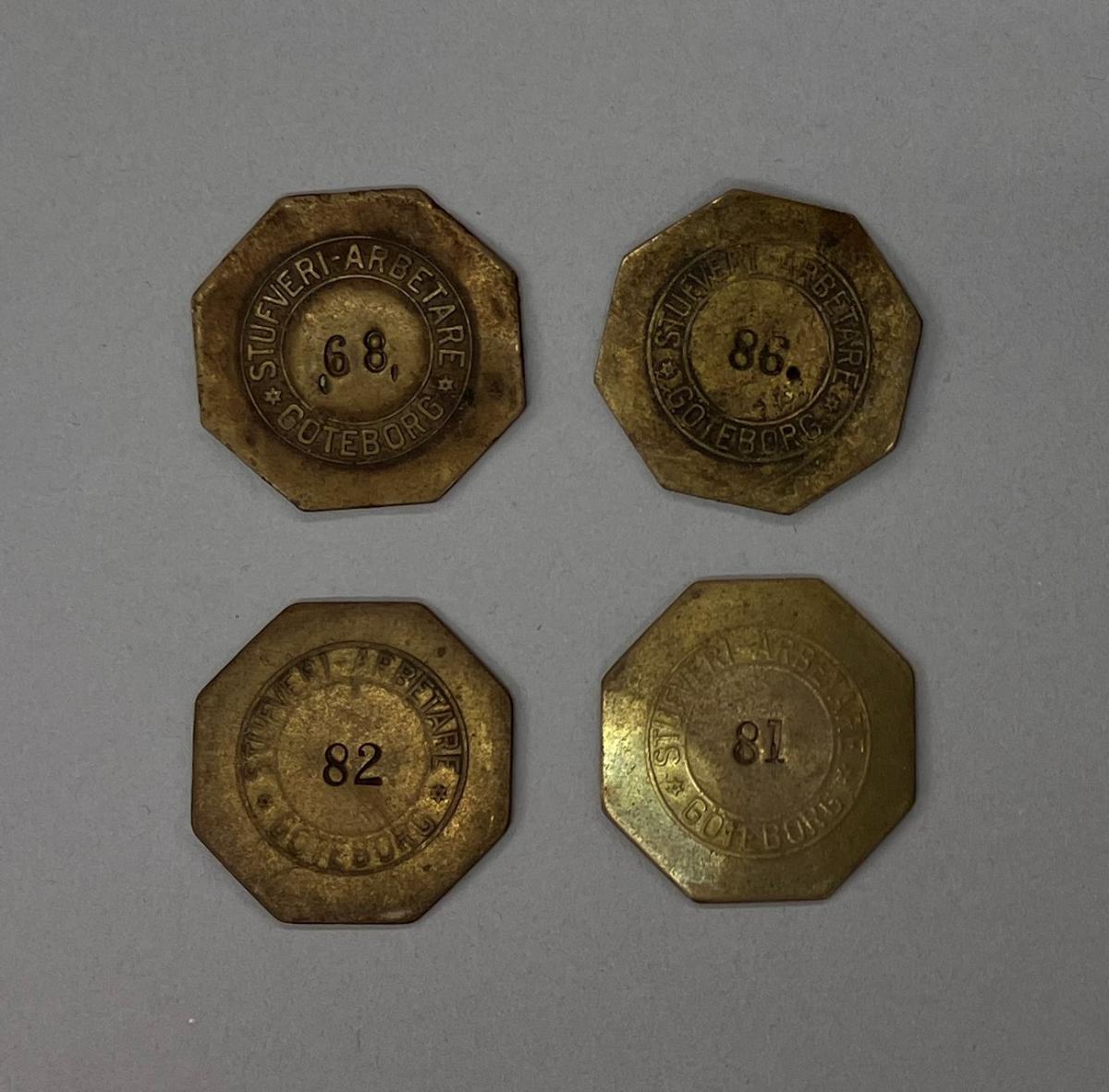 Åttakantig metallbricka märkt ”Stufveriarbetare Göteborg” i relief och i mitten är numret 86 stansat. Enlig nedanstående bör den här brickan vara ifrån 1920- till 1940-talet.