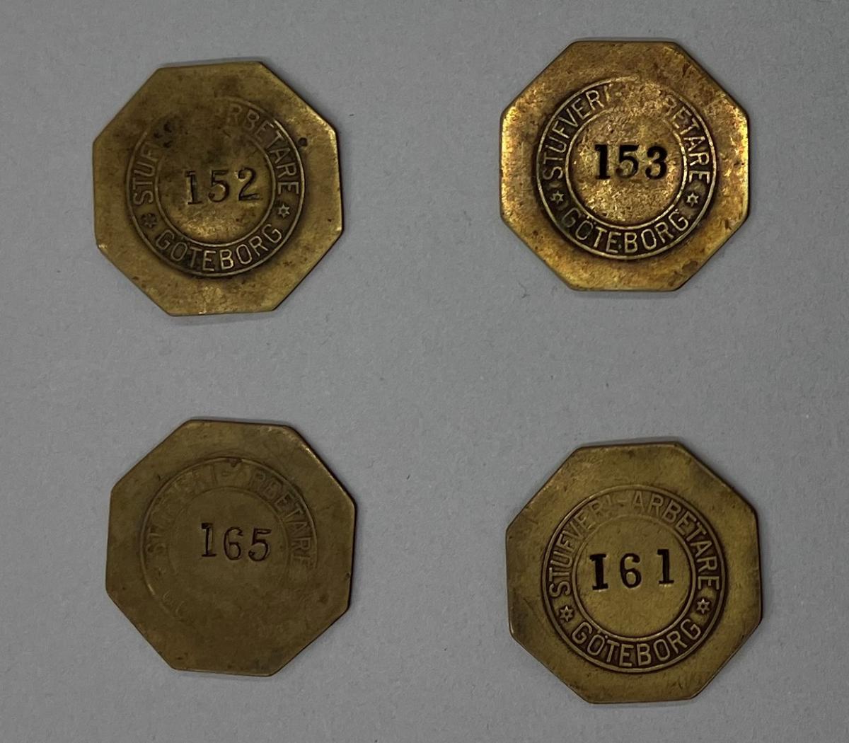Åttakantig metallbricka märkt ”Stufveriarbetare Göteborg” i relief och i mitten är numret 152 stansat. Enlig nedanstående bör den här brickan vara ifrån 1920- till 1940-talet.