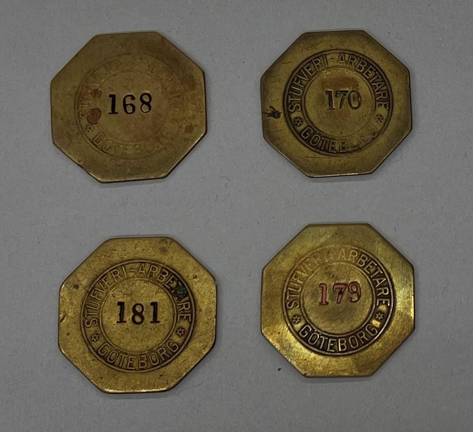Åttakantig metallbricka märkt ”Stufveriarbetare Göteborg” i relief och i mitten är numret 181 stansat. Enlig nedanstående bör den här brickan vara ifrån 1920- till 1940-talet.