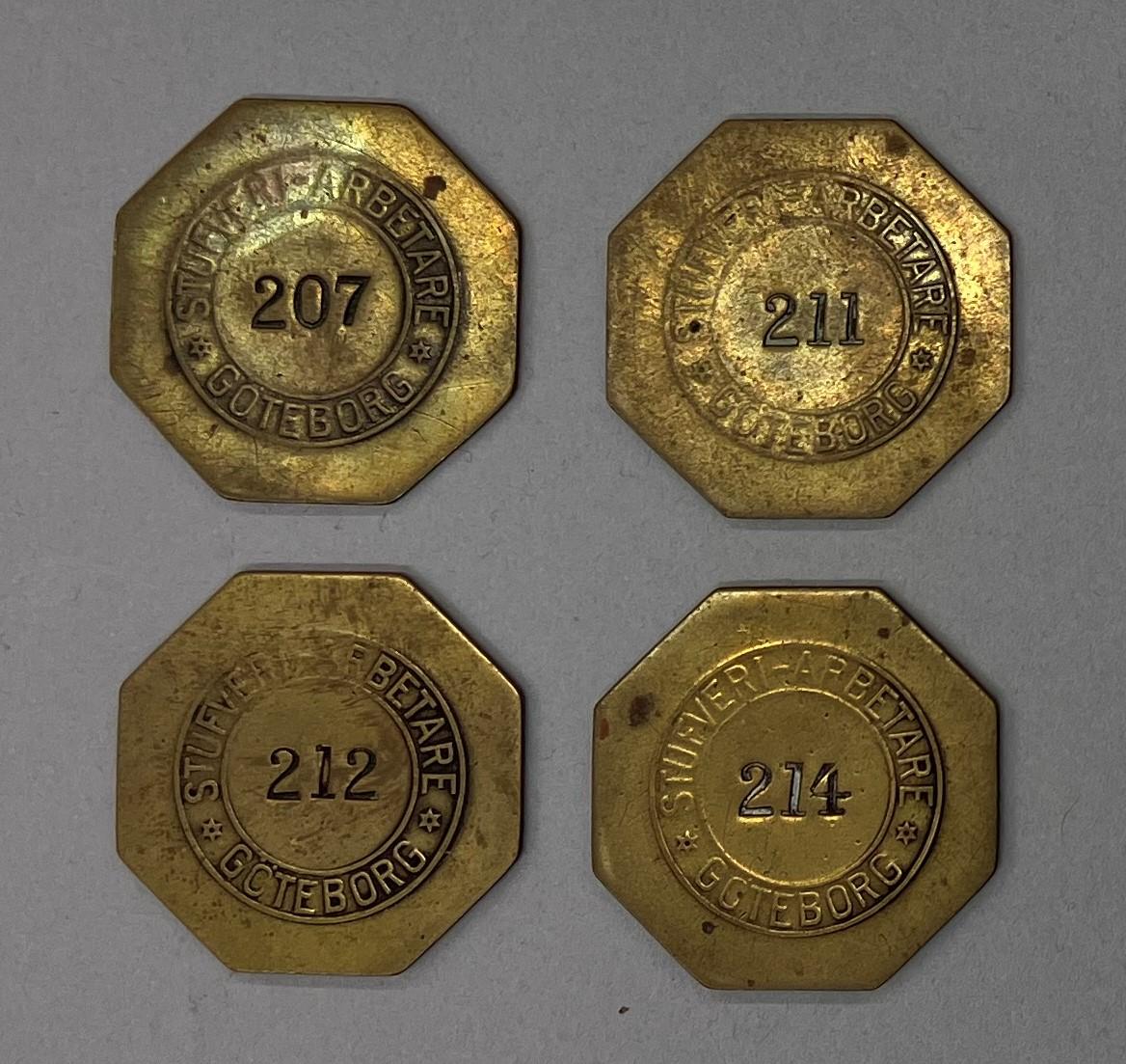Åttakantig metallbricka märkt ”Stufveriarbetare Göteborg” i relief och i mitten är numret 214 stansat. Enligt nedanstående bör den här brickan vara ifrån 1920- till 1940-talet.