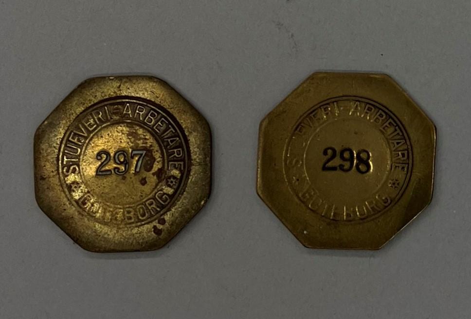 Åttakantig metallbricka märkt ”Stufveriarbetare Göteborg” i relief och i mitten är numret 298 stansat. Enligt nedanstående bör den här brickan vara ifrån 1920- till 1940-talet.