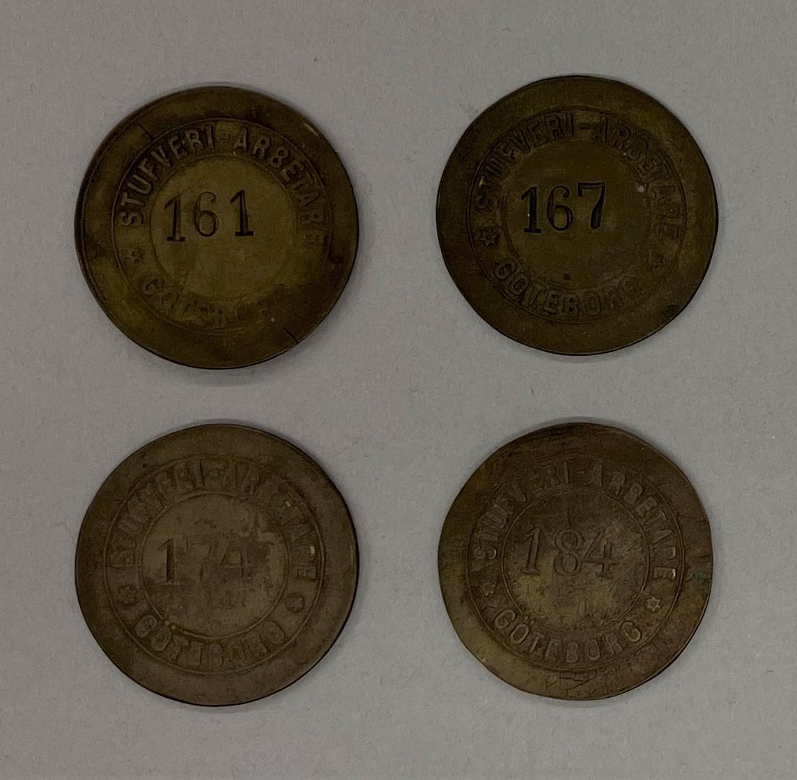 Rund metallbricka märkt ”Stufveriarbetare Göteborg” i relief och i mitten är numret 167 stansat. Enligt nedanstående bör den här brickan vara ifrån perioden 1909 - 1940-talet.
