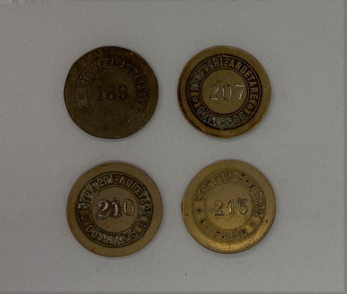 Rund metallbricka märkt ”Stufveriarbetare Göteborg” i relief och i mitten är numret 207 stansat. Enligt nedanstående bör den här brickan vara ifrån perioden 1909 - 1940-talet.