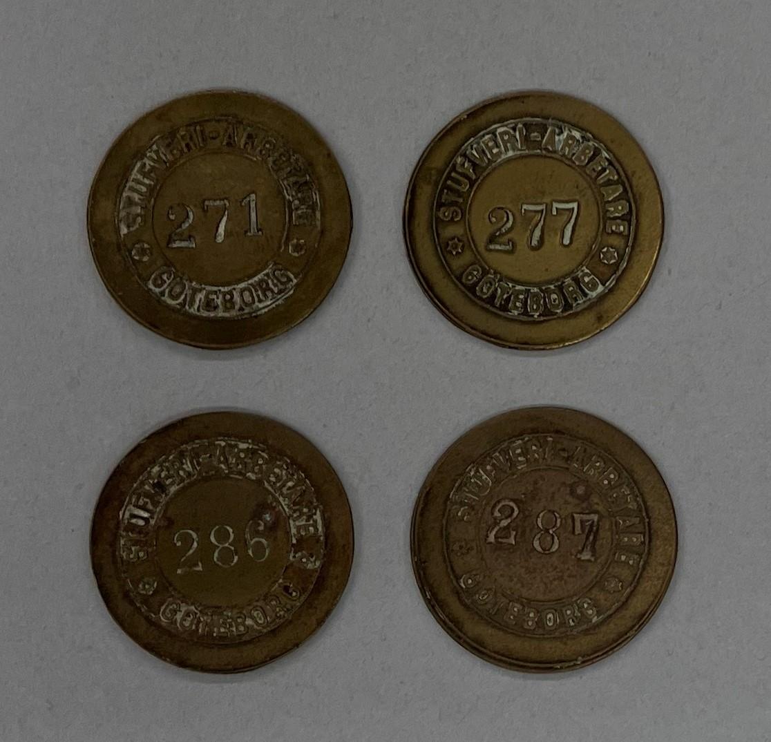 Rund metallbricka märkt ”Stufveriarbetare Göteborg” i relief och i mitten är numret 286 stansat. Enligt nedanstående bör den här brickan vara ifrån perioden 1909 - 1940-talet.