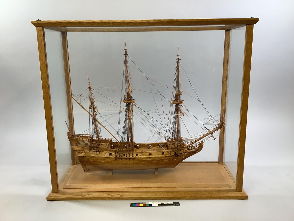 14-kanoners modellskepp föreställande CALMARE NYCKEL. Modellen är byggt i fint trä som är lackat. Montern är byggt i liknande trä.