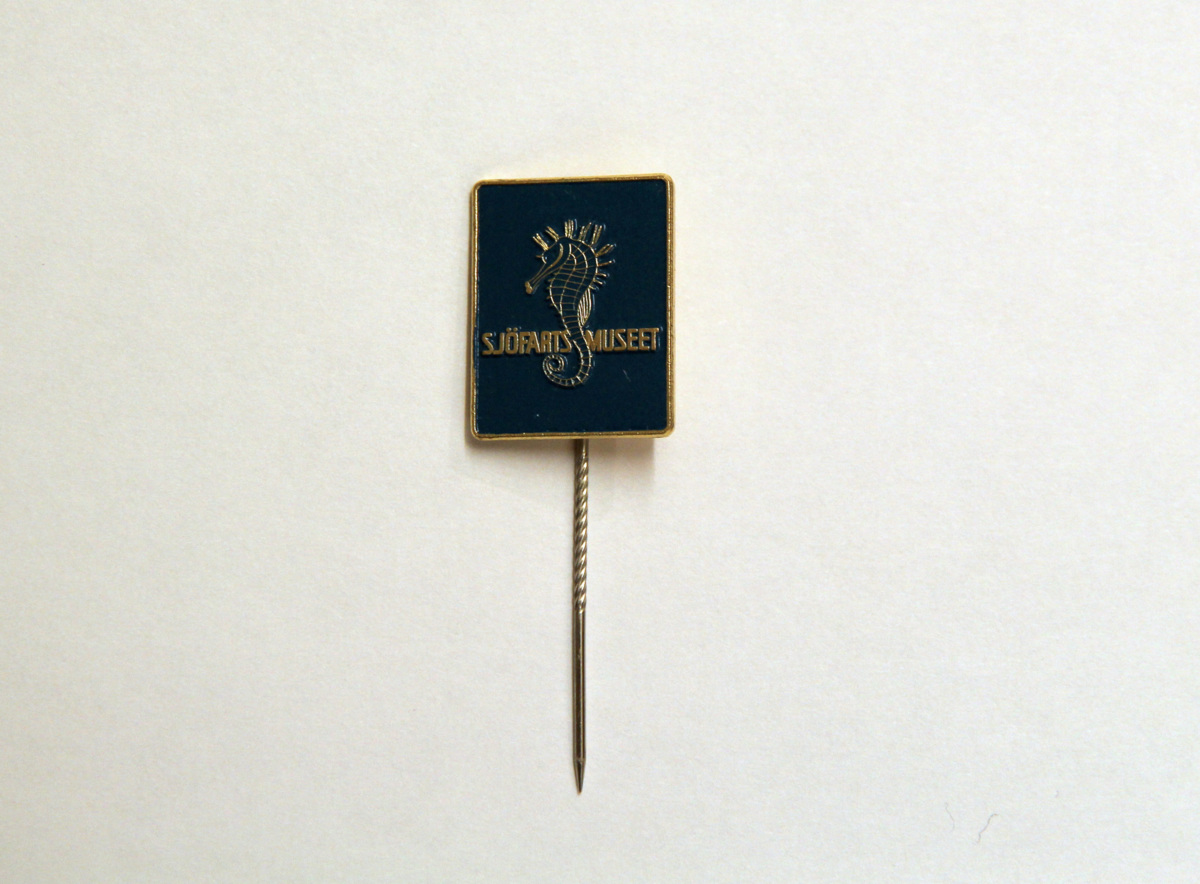Rockslagsmärke/nål från Sjöfartsmuseet Akvariet. På framsidan finns bilden av en sjöhäst och texten Sjöfartsmuseet, i relief.