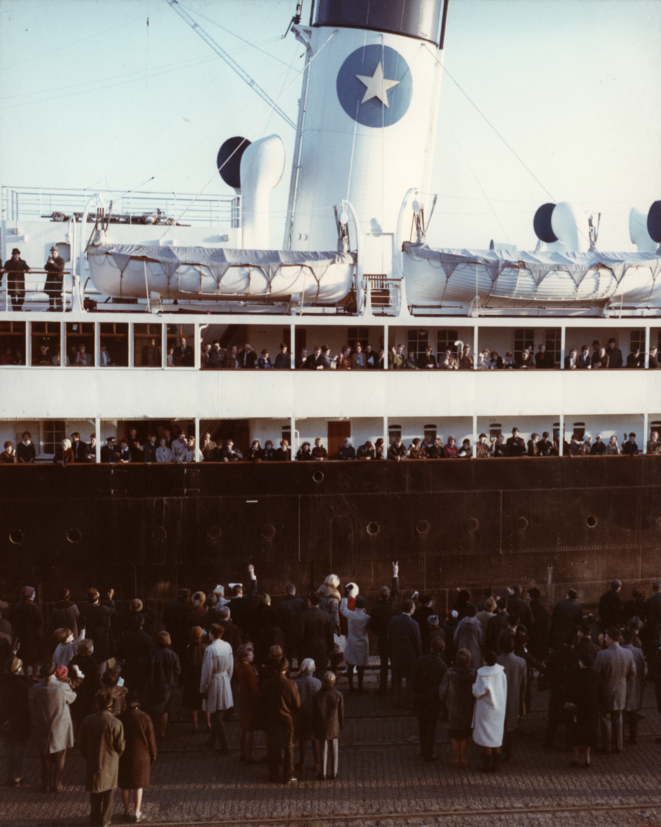SUECIA avgår från kajen. Passagerare ute på däck vinkar till människor nere på kajen.