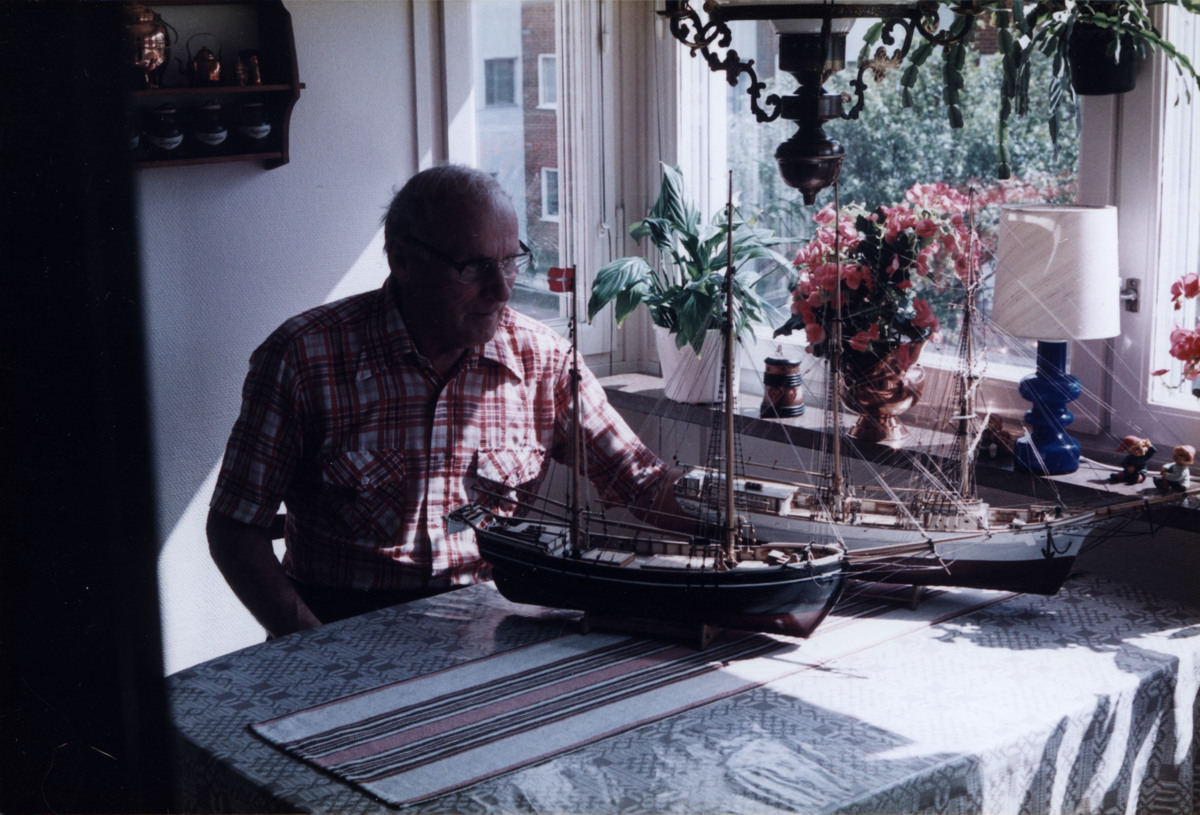 Fotografi föreställande Sten Lundgren sittandes vid ett bord. På bordet står två båtmodeller.