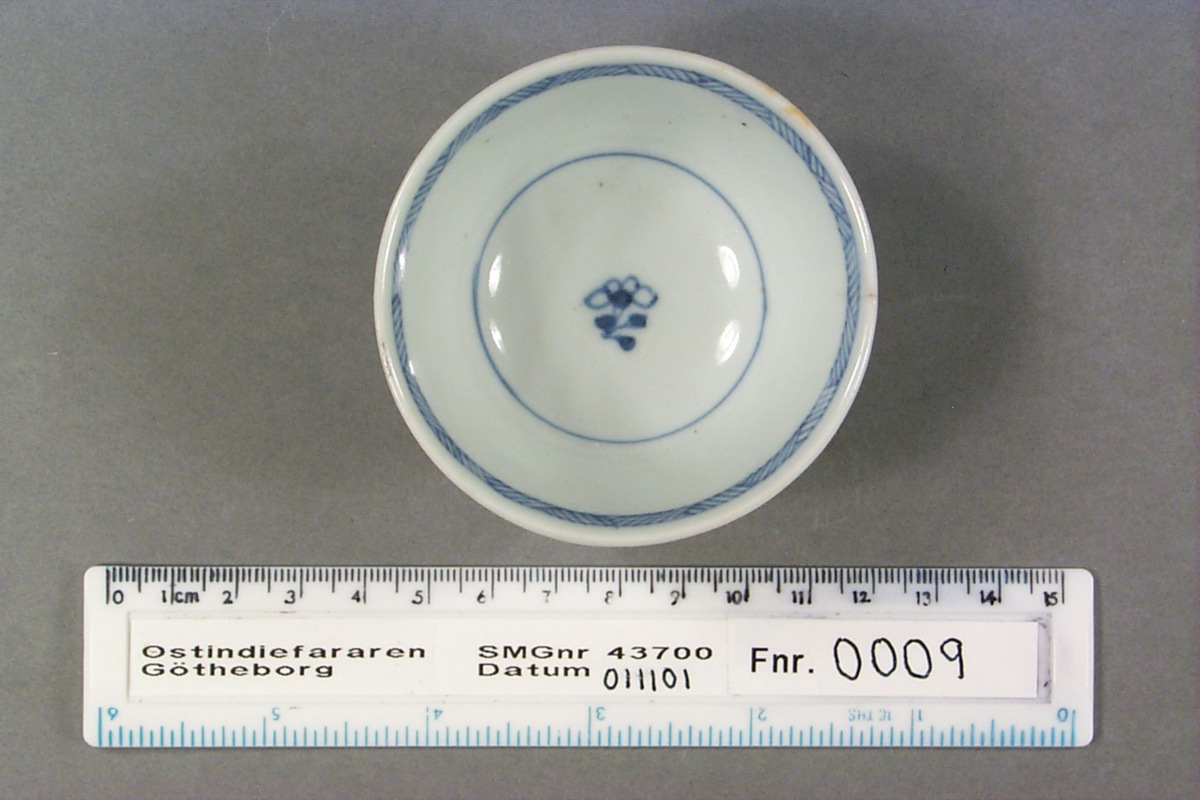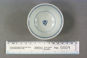 Underglasyrblå dekor. Fin spricka ca 10 mm från kanten och ner.