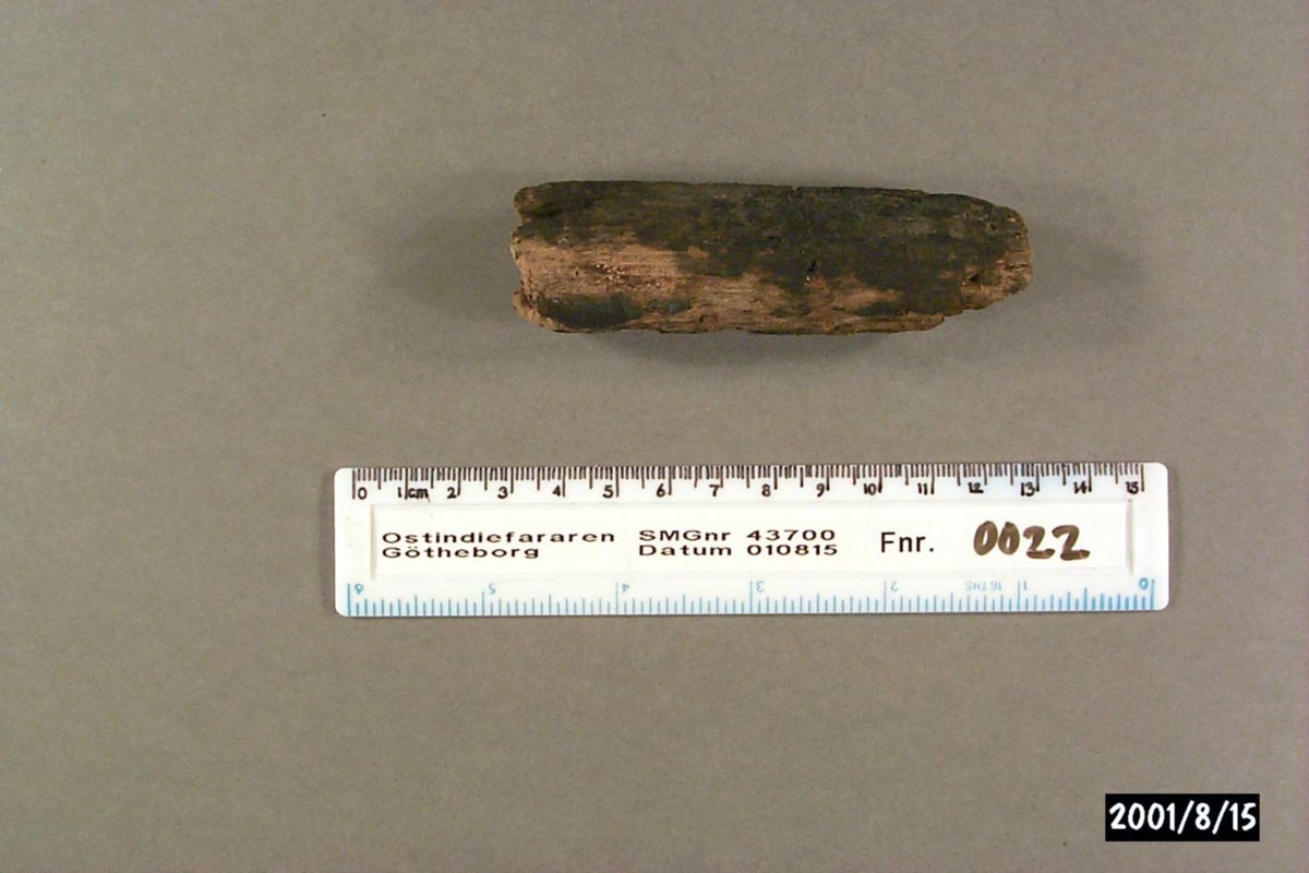 Föremålet är från vraket av ostindiefararen Götheborg, som gjorde tre resor till Kina 1739-45. Vid hemkomsten från den sista resan 12 september 1745 förliste fartyget vid grundet Hunnebådan strax utanför Nya Elfsborgs fästning. Vid flera tillfällen har material tagits upp från vraket. Föremålet kommer från de marinarkeologiska utgrävningarna på platsen 1986-1992.