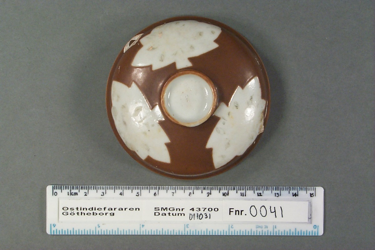 Lock till burk. Välvt med skålformat "handtag" i mitten på ovansidan, oglaserad kant, på undersidan, för passning i burken. Kategori D; brun glasyr med tre ursparningar i form av löv, som dekorerats med emaljfärger. Emaljfärgerna har fallit av, endast spår i ljusgrönt och grått.