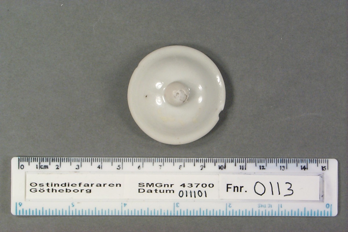 Kategori G; vitt med emaljfärgsdekor. Litet lock till kanna eller burk. Kant undertill för passning mot mynningskant, droppformad knopp, delvis med skadad glasyr. Dekoren bortfallen; endast spår. Avslagen flisa i kanten.