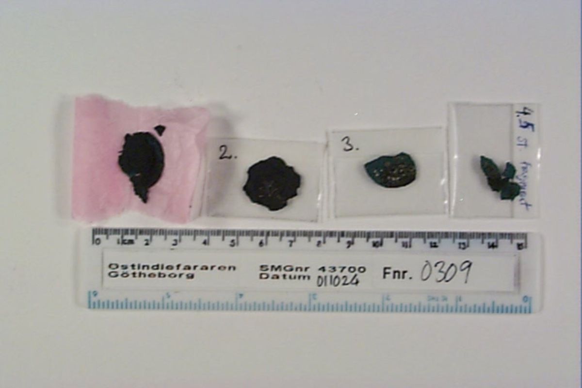 3) Holländskt mynt, VOC-duit, vapensköld? Kraftigt korroderat, mörkgrön korrosion, saltutfällningar. KMK 711-1694-1996.