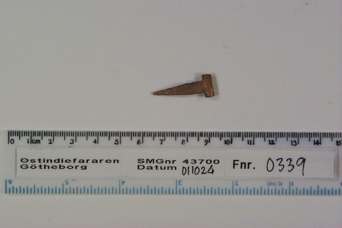Föremålet är från vraket av ostindiefararen Götheborg, som gjorde tre resor till Kina 1739-45. Vid hemkomsten från den sista resan 12 september 1745 förliste fartyget vid grundet Hunnebådan strax utanför Nya Elfsborgs fästning. Vid flera tillfällen har material tagits upp från vraket. Föremålet kommer från de marinarkeologiska utgrävningarna på platsen 1986-1992.