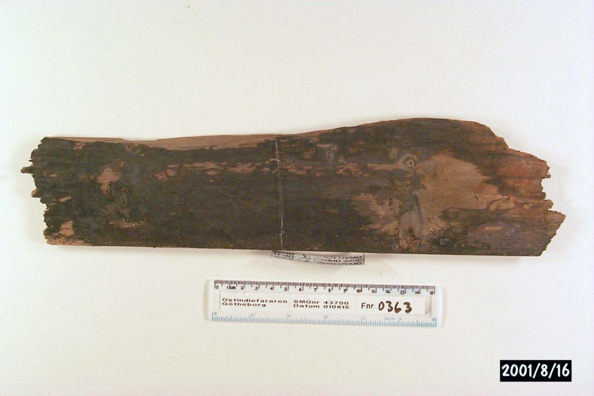 Föremålet är från vraket av ostindiefararen Götheborg, som gjorde tre resor till Kina 1739-45. Vid hemkomsten från den sista resan 12 september 1745 förliste fartyget vid grundet Hunnebådan strax utanför Nya Elfsborgs fästning. Vid flera tillfällen har material tagits upp från vraket. Föremålet kommer från de marinarkeologiska utgrävningarna på platsen 1986-1992.