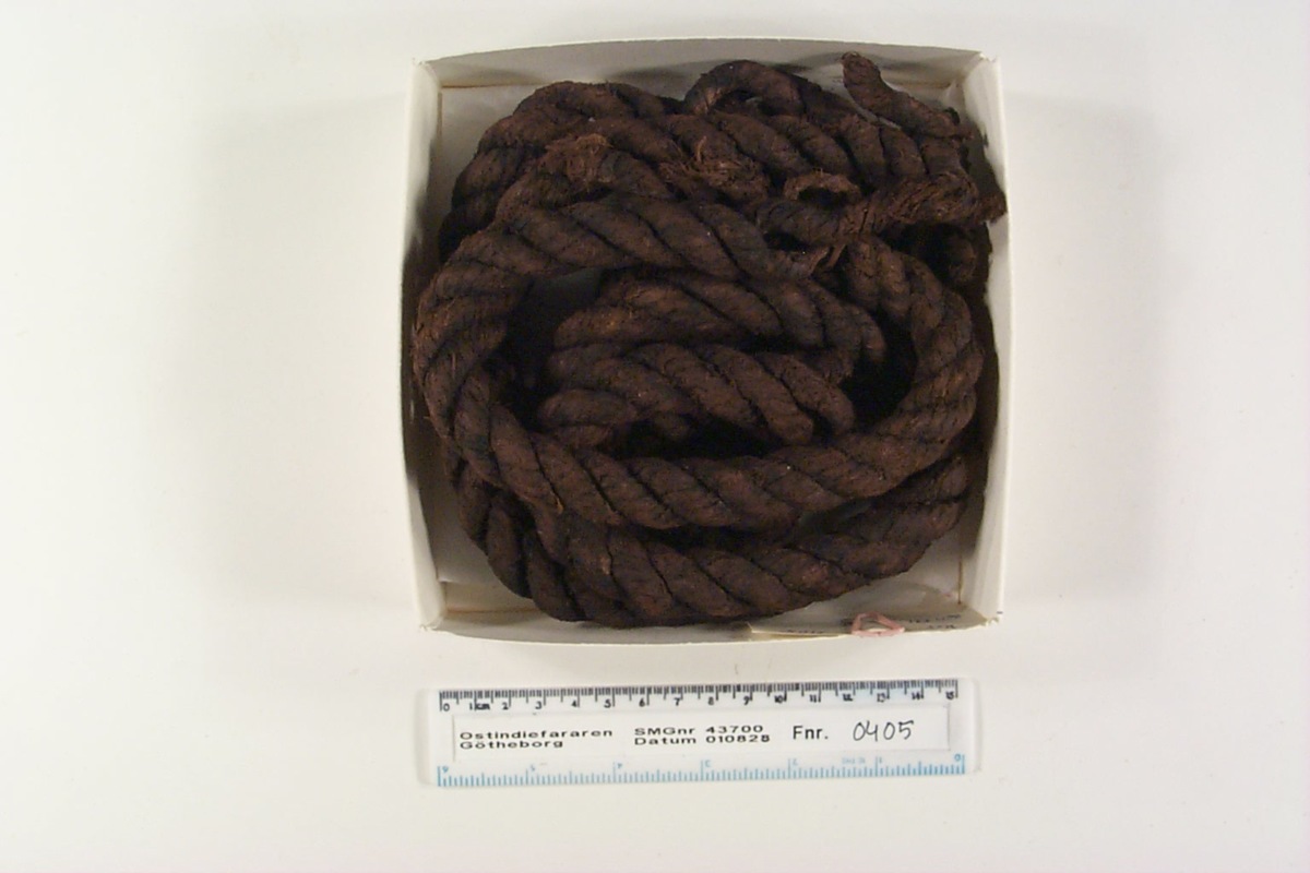 Föremålet är från vraket av ostindiefararen Götheborg, som gjorde tre resor till Kina 1739-45. Vid hemkomsten från den sista resan 12 september 1745 förliste fartyget vid grundet Hunnebådan strax utanför Nya Elfsborgs fästning. Vid flera tillfällen har material tagits upp från vraket. Föremålet kommer från de marinarkeologiska utgrävningarna på platsen 1986-1992.