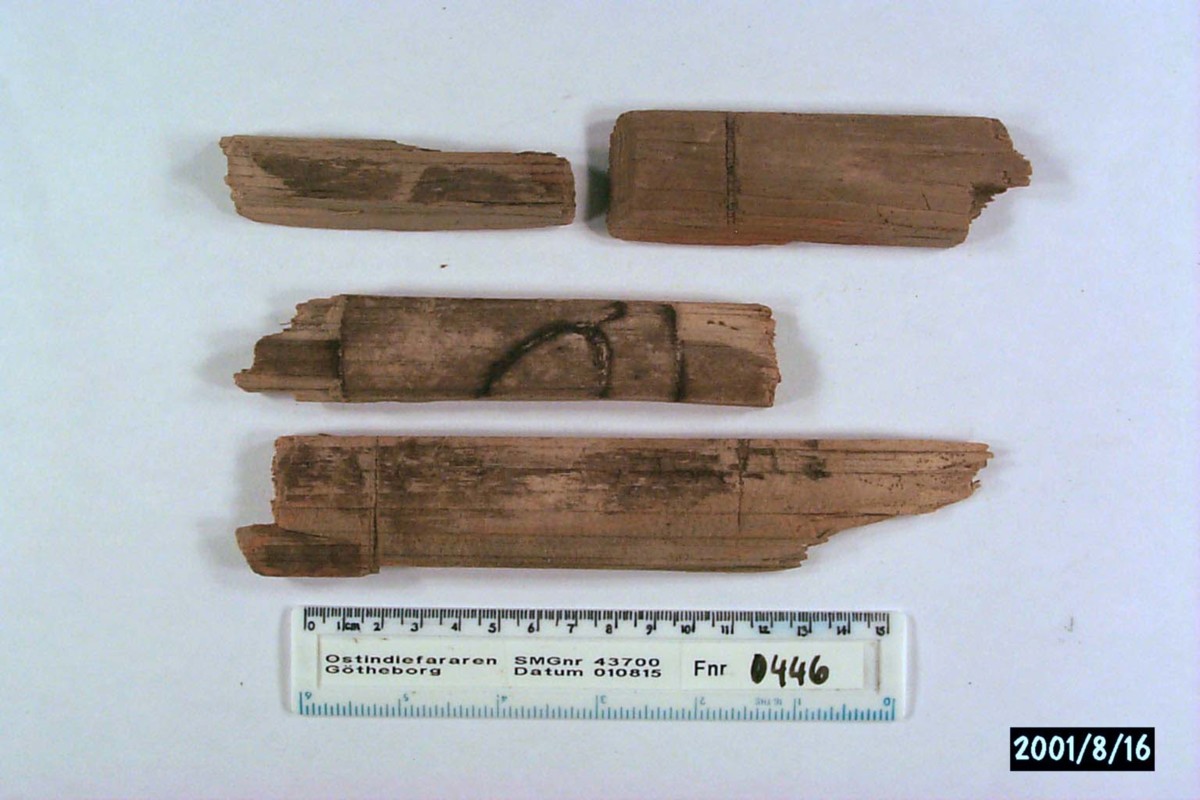 Föremålet är från vraket av ostindiefararen Götheborg, som gjorde tre resor till Kina 1739-45. Vid hemkomsten från den sista resan 12 september 1745 förliste fartyget vid grundet Hunnebådan strax utanför Nya Elfsborgs fästning. Vid flera tillfällen har material tagits upp från vraket. Föremålet kommer från de marinarkeologiska utgrävningarna på platsen 1986-1992.